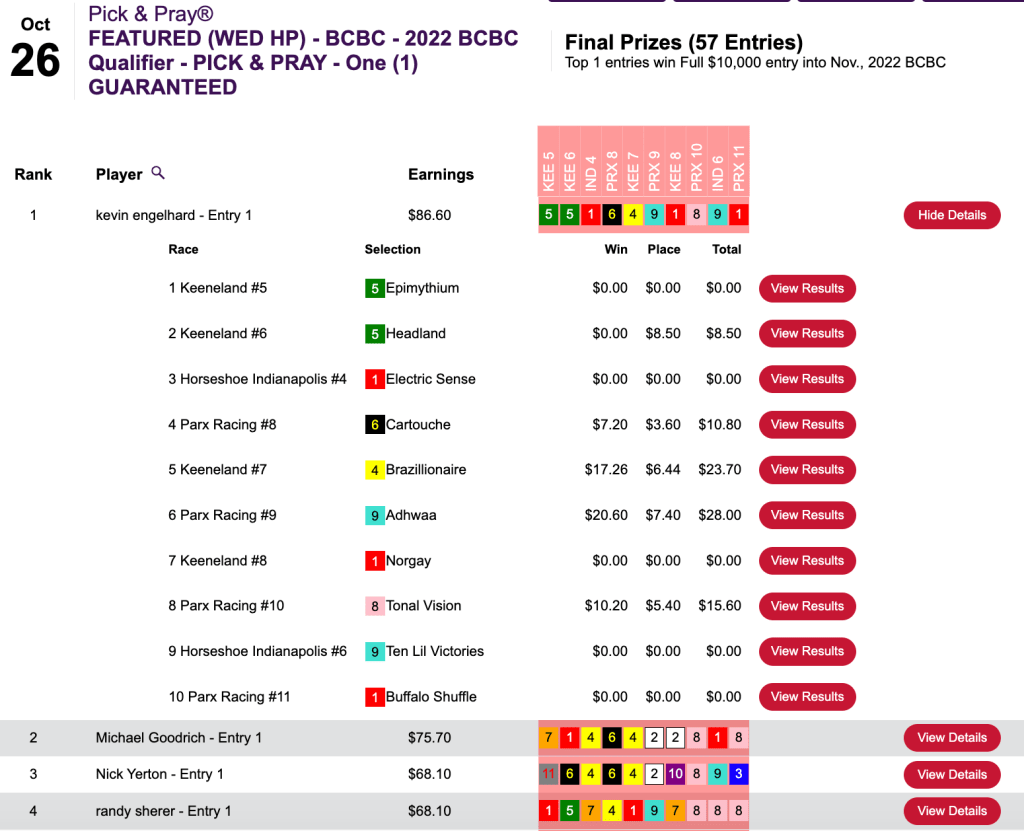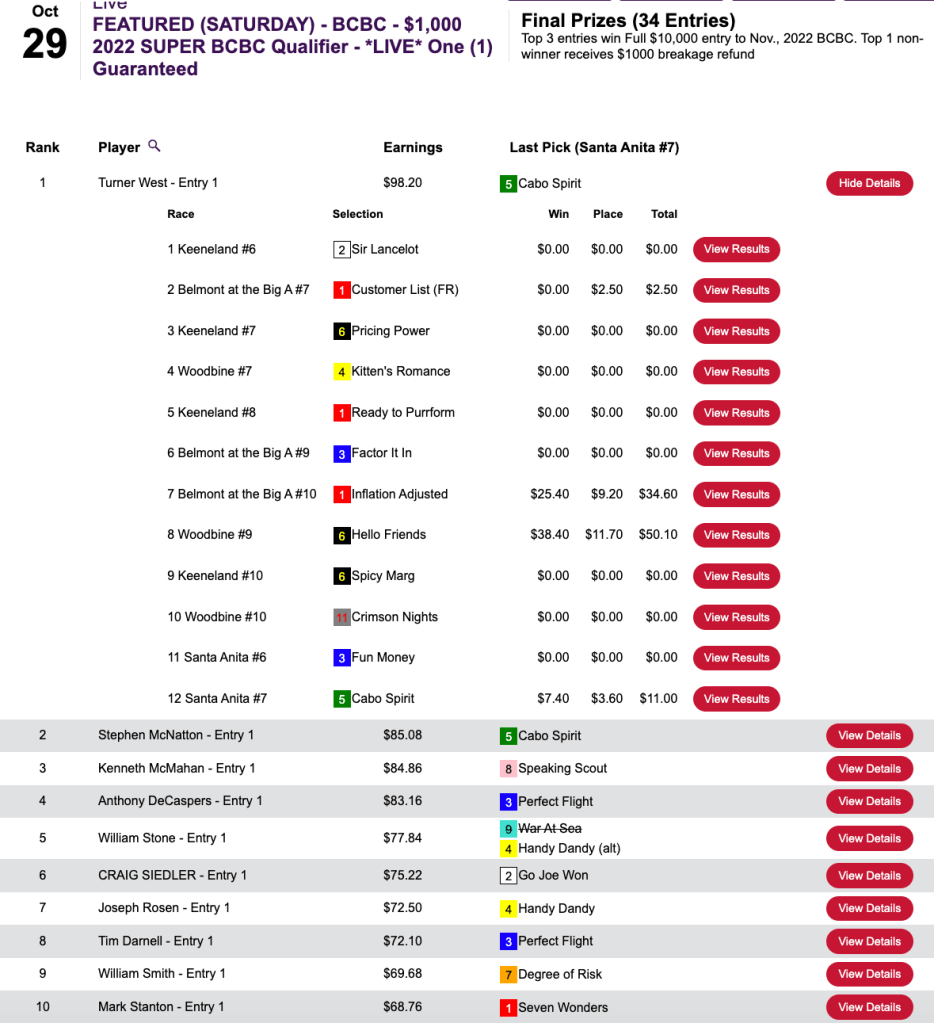 West won here as well, giving him two BCBC seats in as many days. There were enough entries to award three $10,000 entries, though, and those other two went to Stephen McNatton (3W, 2P) and Kenny McMahan, who got up for 3rd with a $4.40 place payoff in the finale. For McMahan, it was his 6th place collection of the day. He also had two winners.