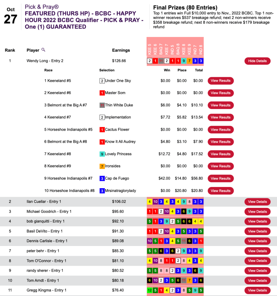 Long had the high score of the day in taking Thursday’s $179 Breeders’ Cup Betting Challenge Pick & Pray. Despite nailing 5 winners over the first 9 contest races, she needed a $20.80 place collection to hold off (via a block) Ilan Cuellar.