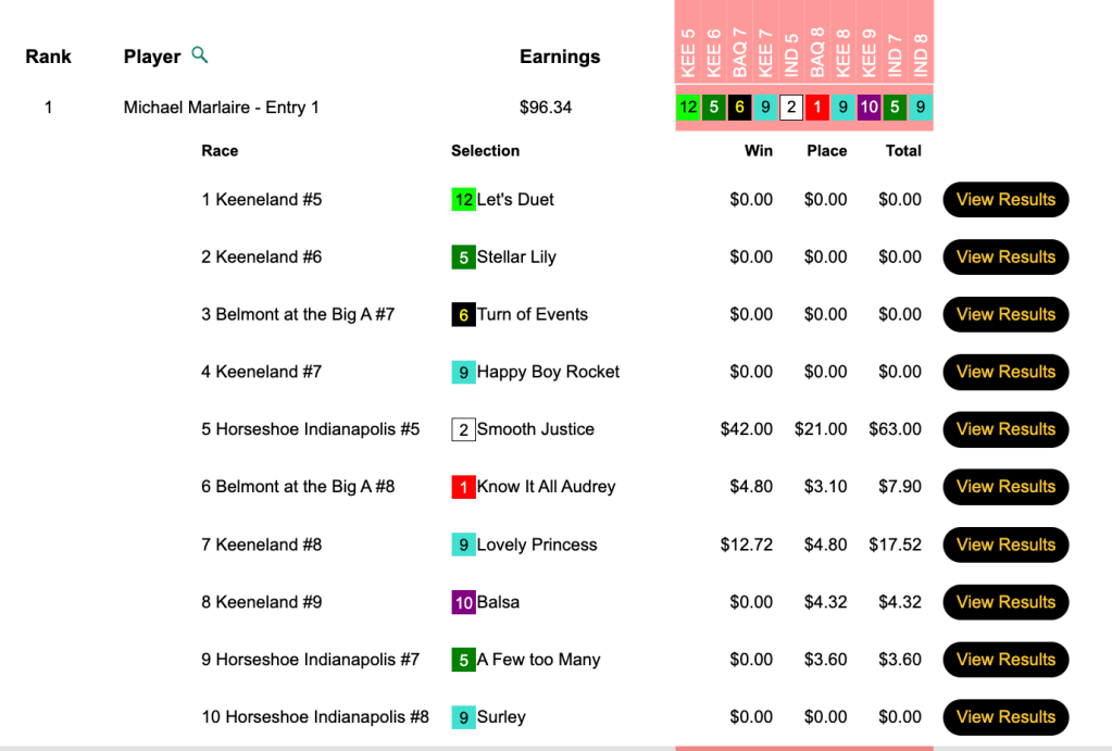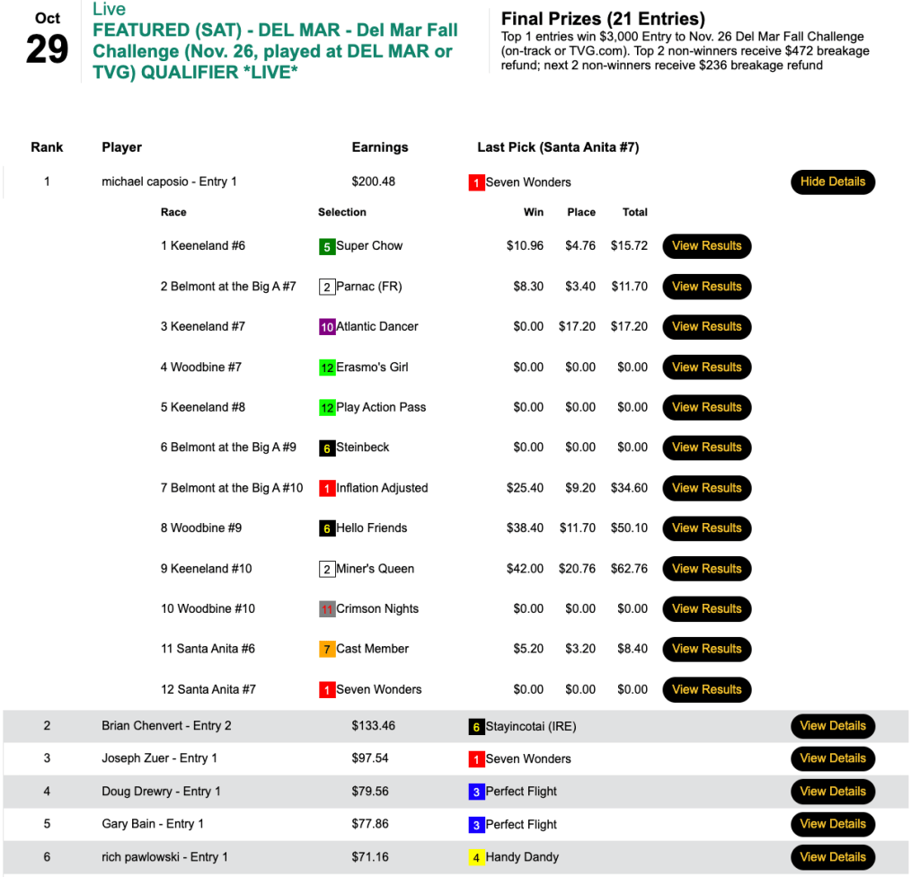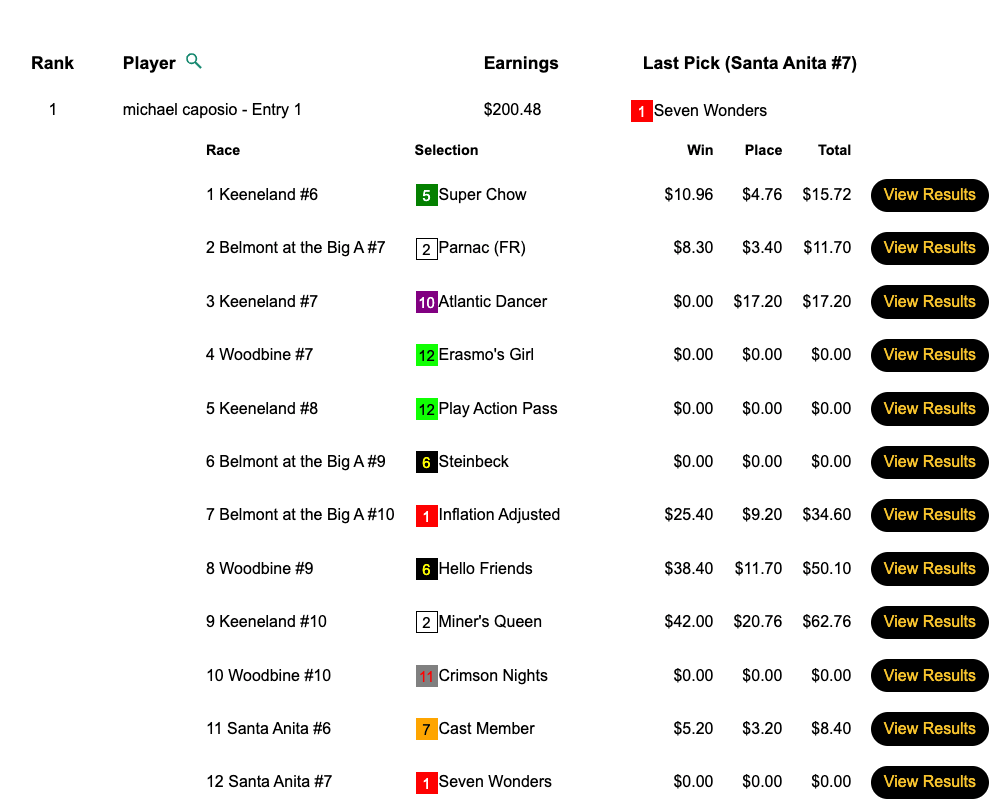 We missed our purse guarantee (leaving the crack HorseTourneys accounting staff unhappy), but Caposio did sort of guaranteed himself victory…by coming up with an incredible 12-race score of $200.40.