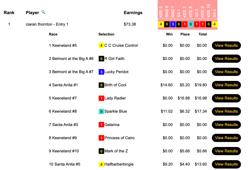 She had Halfbarbiebingie at the end, after earlier hitting 2 wins and a place, to get up by a full 16 cents over Eric Kurzhal. Those Keeneland pennies count!