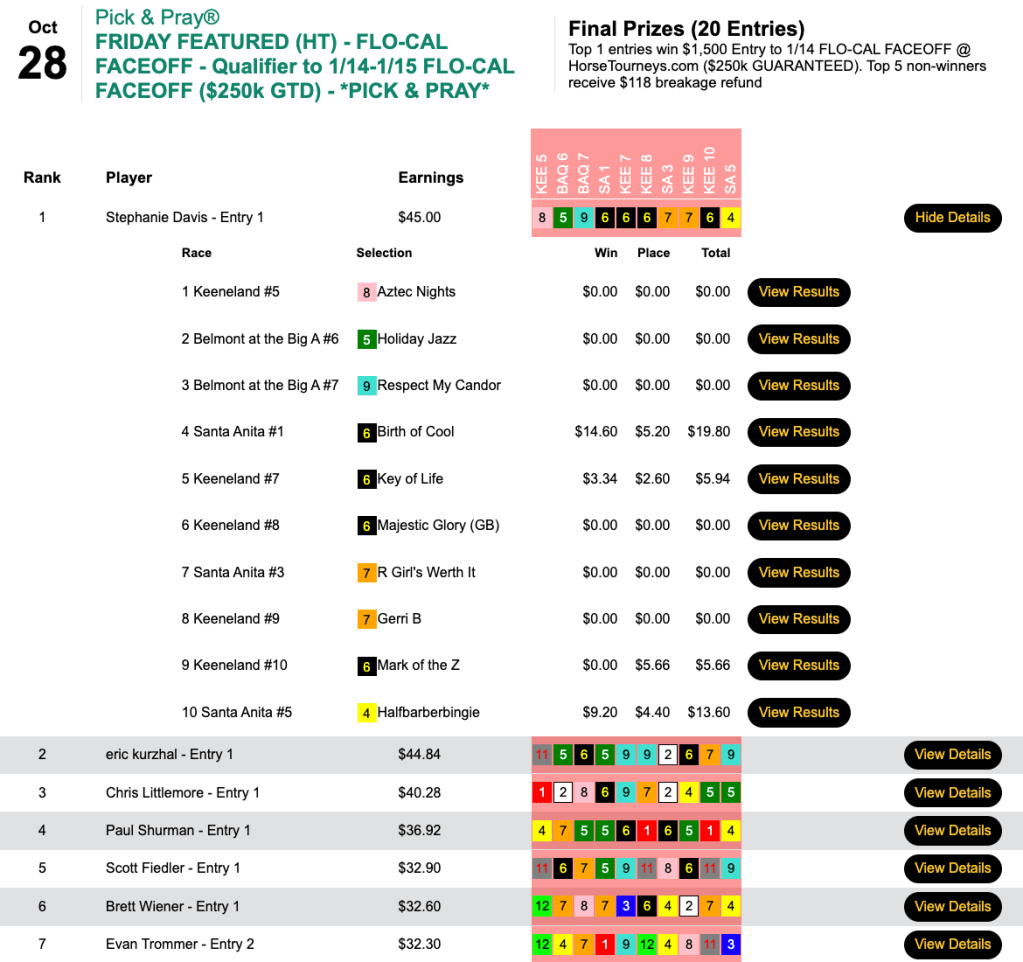 Scores were low on Friday given that the day’s top winner paid $14.40 (Birth of Cool in the 1st at Santa Anita). Joe Pettit (the 2018 The BIG One champ) had that one.
