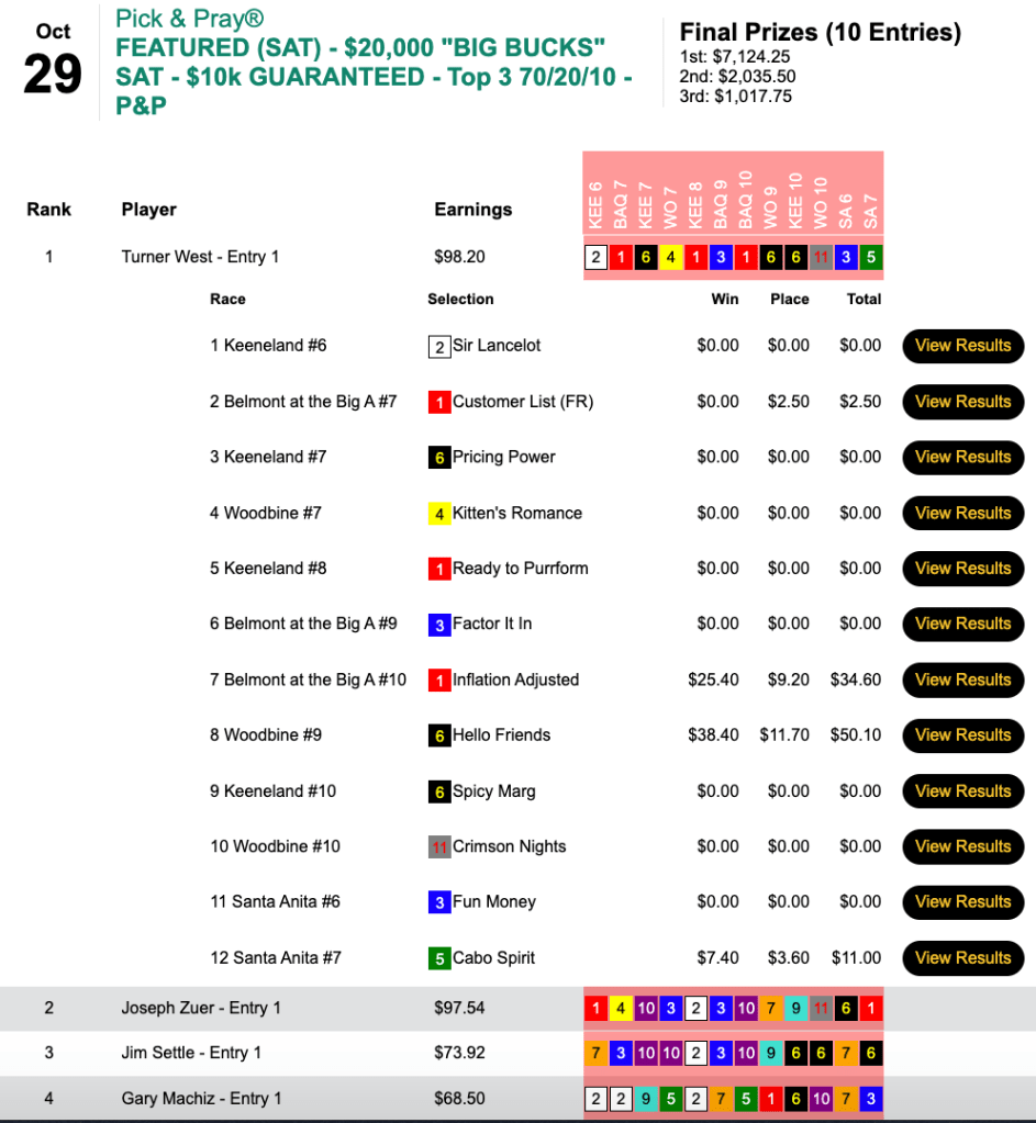 West was best (by 66 cents) in Saturday’s $10,000 Guaranteed Big Bucks Pick & Pray, a tourney that rewarded him to the tune of $7,124. He had Jim Nantz’s favorite horse, Hello Friends (an 18-1 winner at Woodbine), plus a 5-2 winner in the last race to get up for the W.