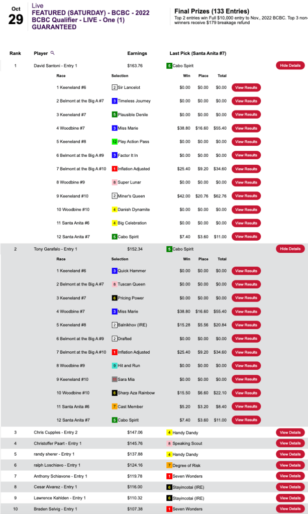 Elsewhere on the Saturday BCBC qualifying front at HorsePlayers, David “The Great” Santoni (4 wins, 0 places) and Tony Garofalo (6W, 0P) were the $10,000 seat winners in the day’s $179 play-in.