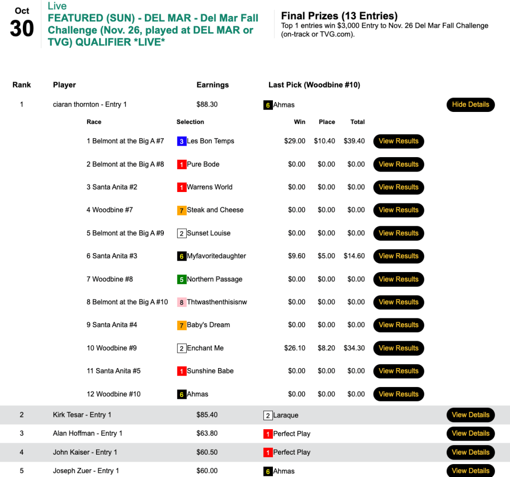 The good times continued for Thornton thanks in part to Les Bon Temps. The BAQ 13-1 winner plus 12-1 Woodbine victor Enchant Me helped secure Thornton a $3,000 entry into the November 26 Del Mar Fall Challenge.