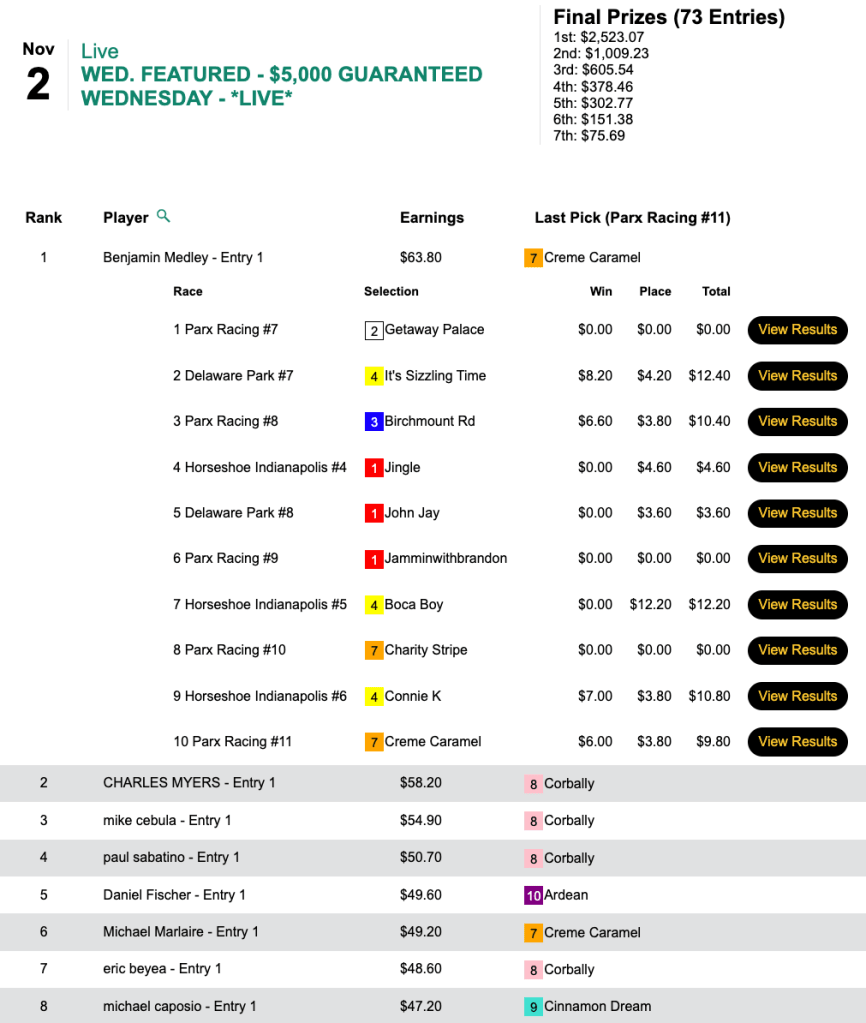 Benjamin Medley, that is. His 4 winners paid no higher than $8.20, but he also chipped up with 3 place collections on a chalky day, and he took home the up-top money of $2,523 in Wednesday’s $5,000 Guaranteed cash tourney.