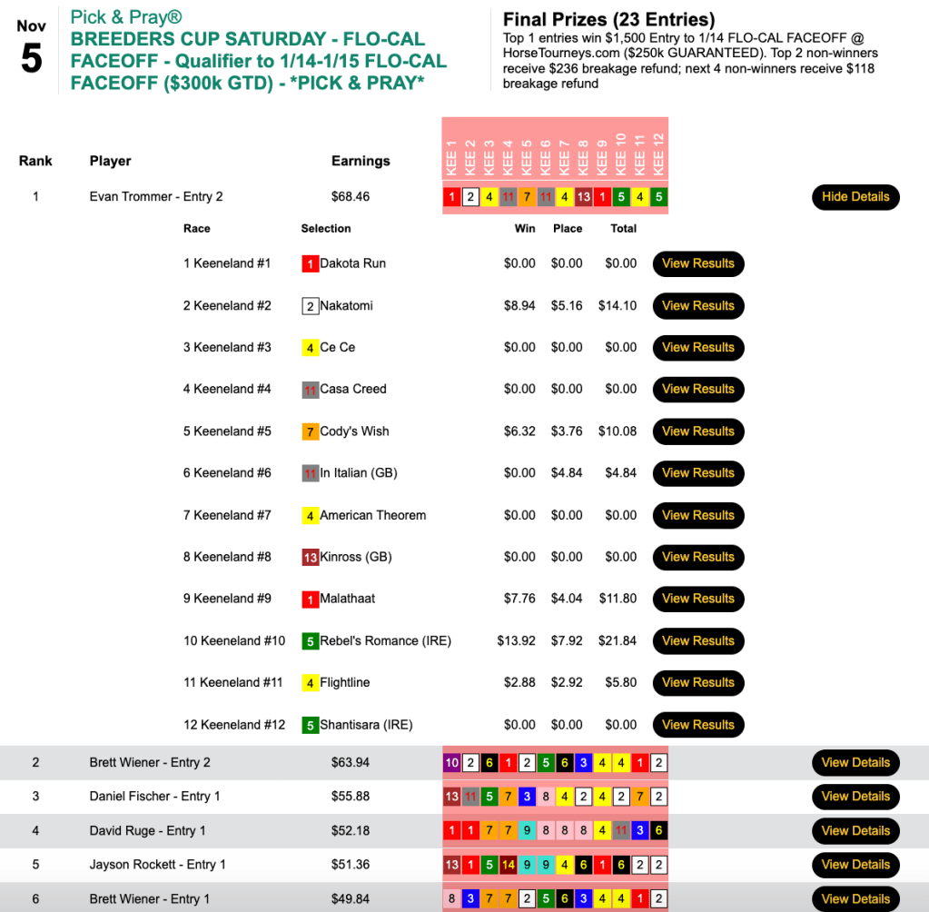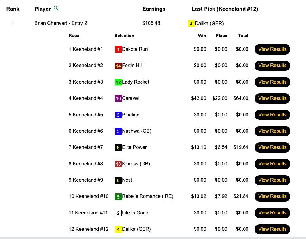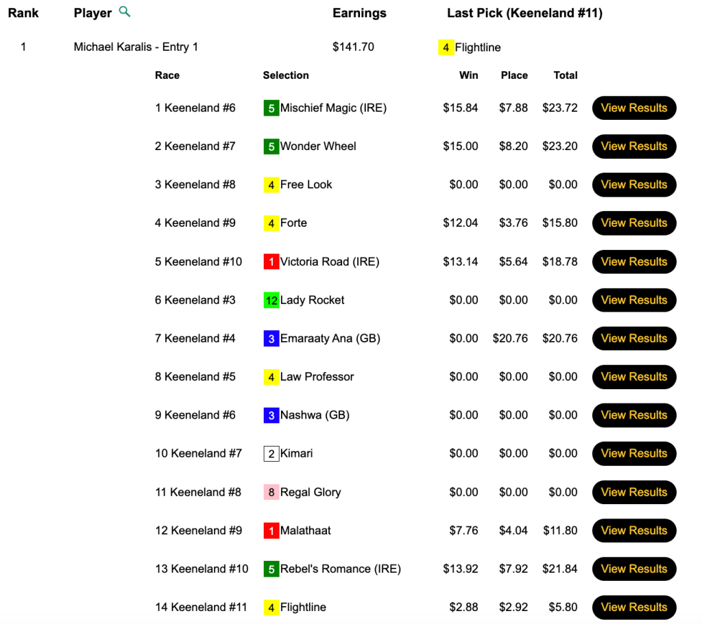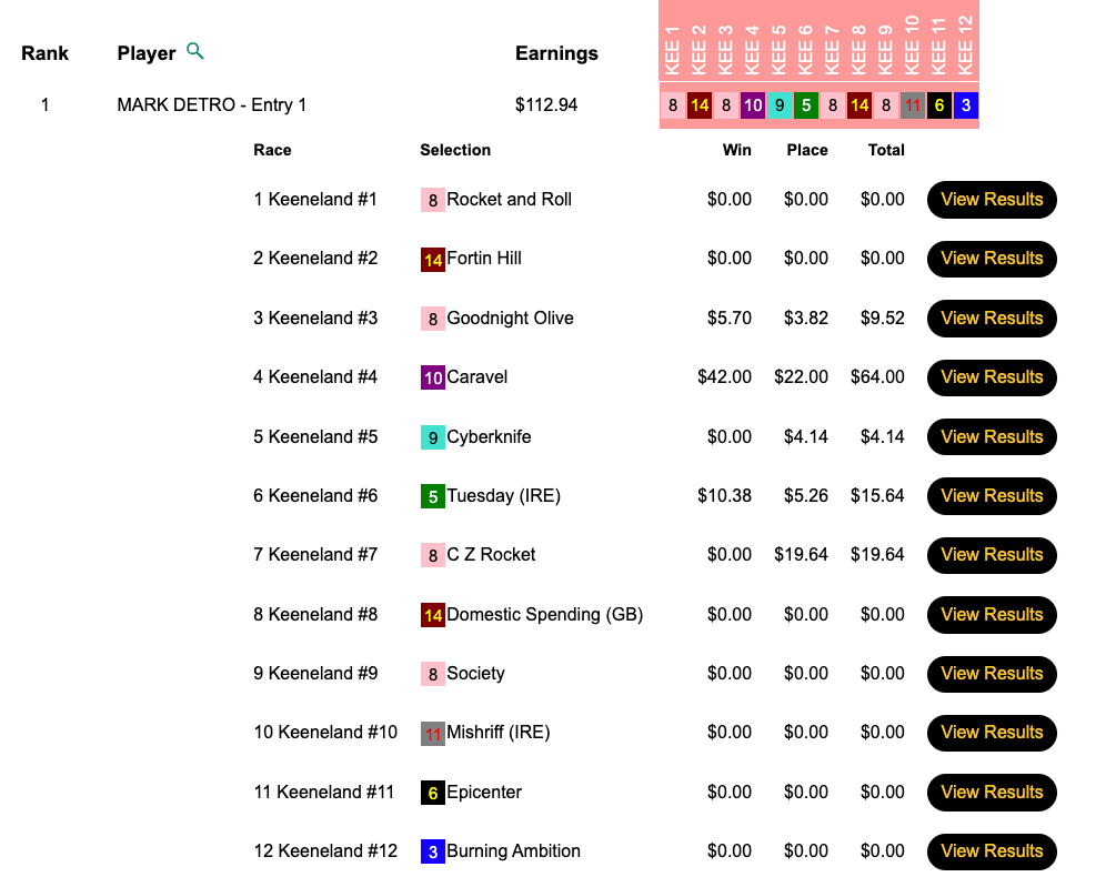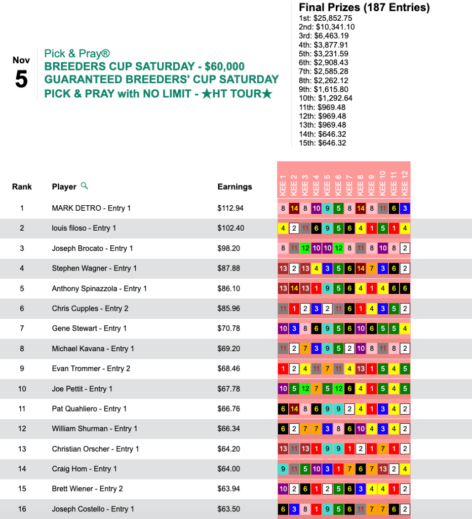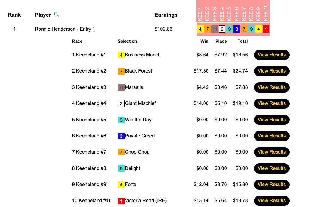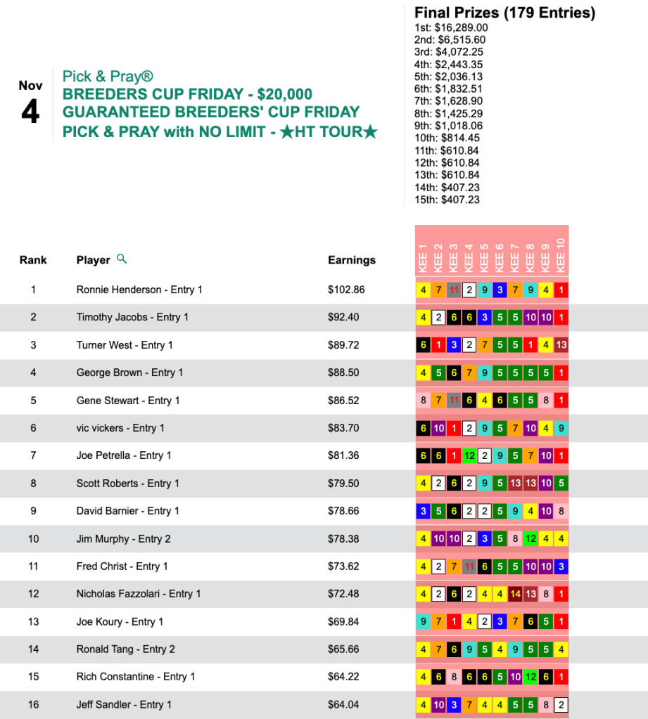 Though the guarantee was lower in the Pick & Pray vs. the Live tourney, the final purse amount was $10,000 higher—$40,722—in the Pick & Pray. Ronnie Henderson was glad that that was the case. He hit the first four winners on the Friday Keeneland card, took a lunch break, then added the final two. His reward was $16,289…which will buy a lot of lunches.