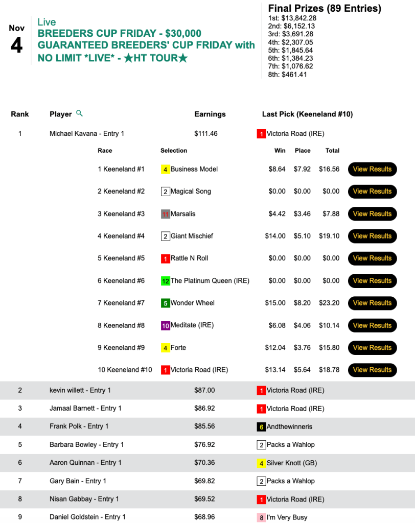 In Friday’s $30,000 Guaranteed, full-card Keeneland cash tourney, Kavana picked 7 winners out of 10 races, including the final four of the five Breeders’ Cup races. (Only Mischief Magic stood between him and Friday Breeders’ Cup perfection —and even in that race, the Juvenile Turf Sprint, Kavana had the right idea…he just opted for the wrong Euro, The Platinum Queen.)