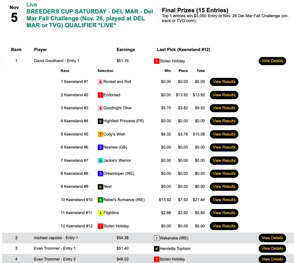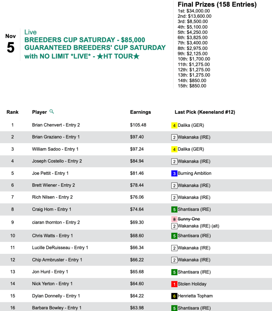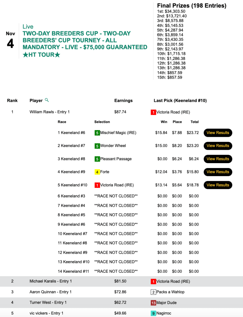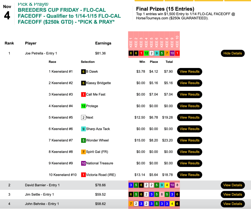 Like Kavana, Karalis also came up with four winners in the five Friday Breeders’ Cup races. However, he still somehow found himself trailing William “You’ll never find” Rawls after Day 1 of our two-day, $75,000 Guaranteed, Breeders’ Cup-only tourney.