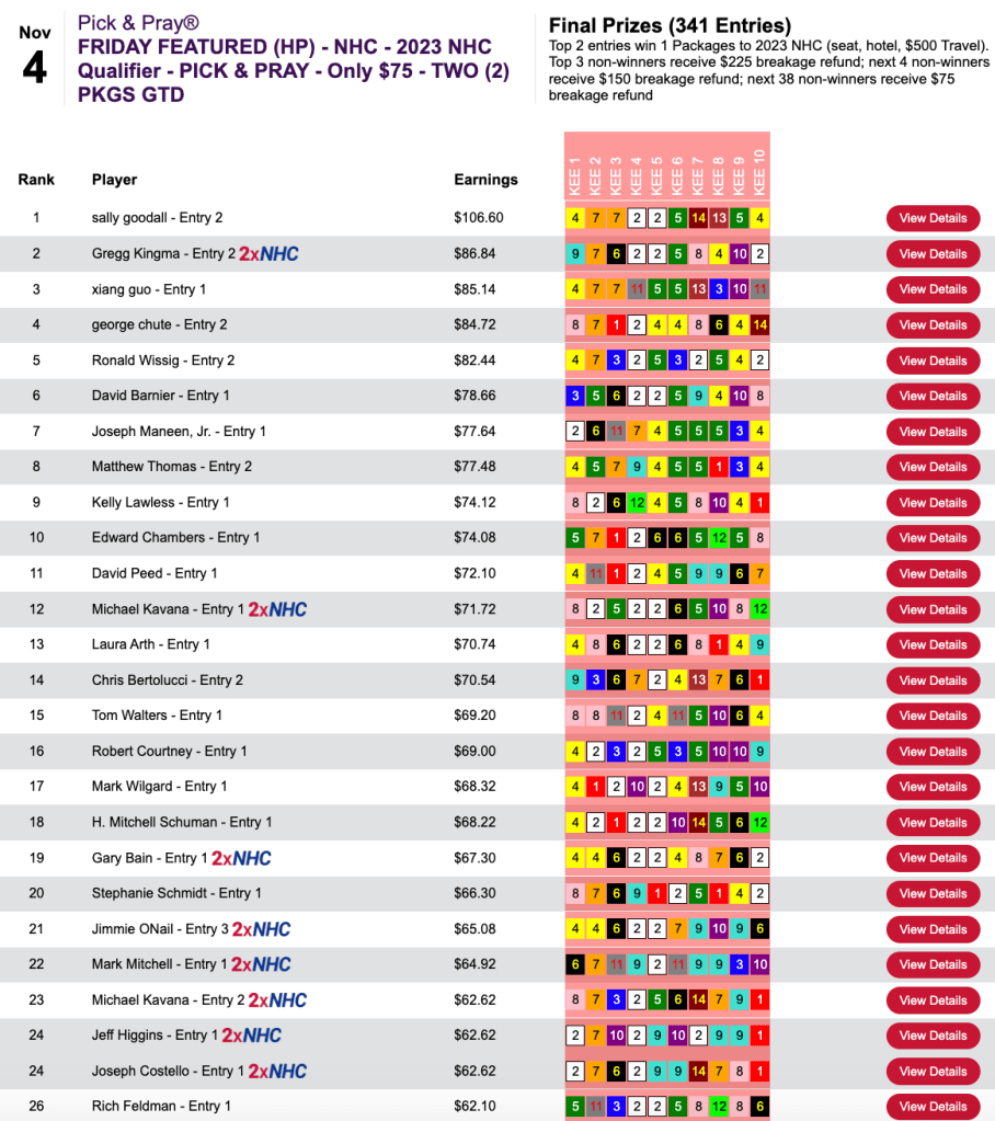 Qualifying for the NHC resumed at HorsePlayers on Sunday after a brief hiatus. The feature was a $165 play-in restricted to those who had yet to earn a 2023 seat.