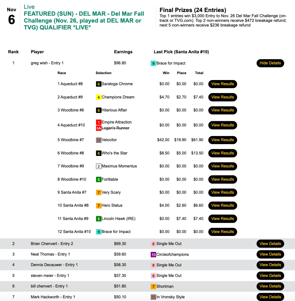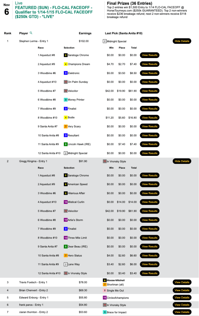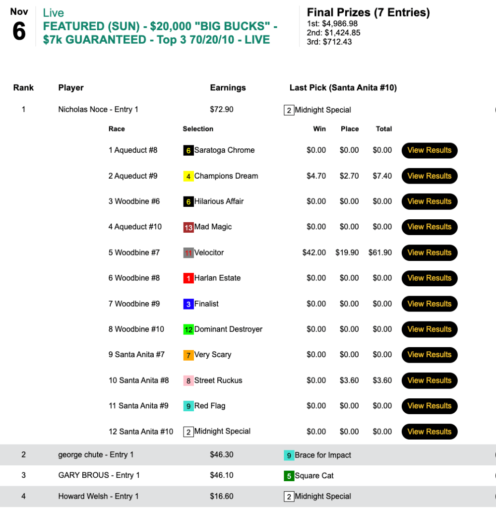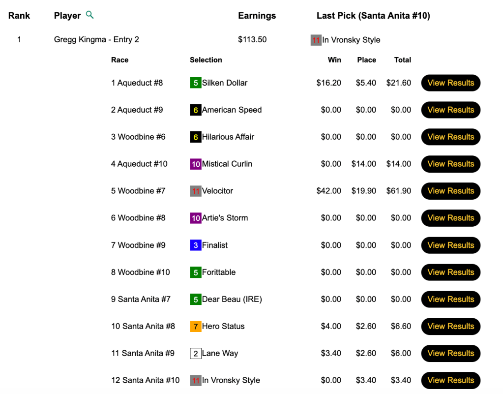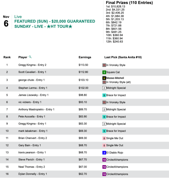 Like some may hope to do tomorrow, Kavana may have benefited from “low voter turnout” last Thursday in our $6,000 Guaranteed Pick & Pray. Only 67 ballots were cast, which meant a 13.3% overlay to players and about $700 in “free money” in the prize pool. Nevertheless, Kavana’s 10 selections provided him with broad-based support (5 wins and a place) that allowed him to declare victory…and claim the $2,700 that went with it.