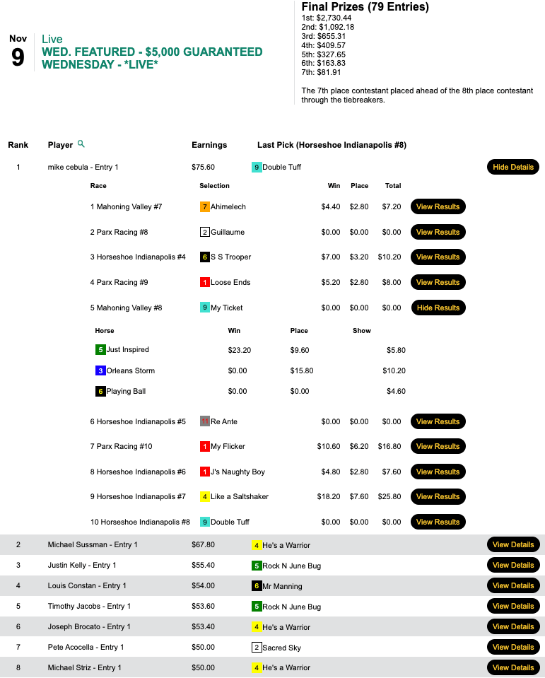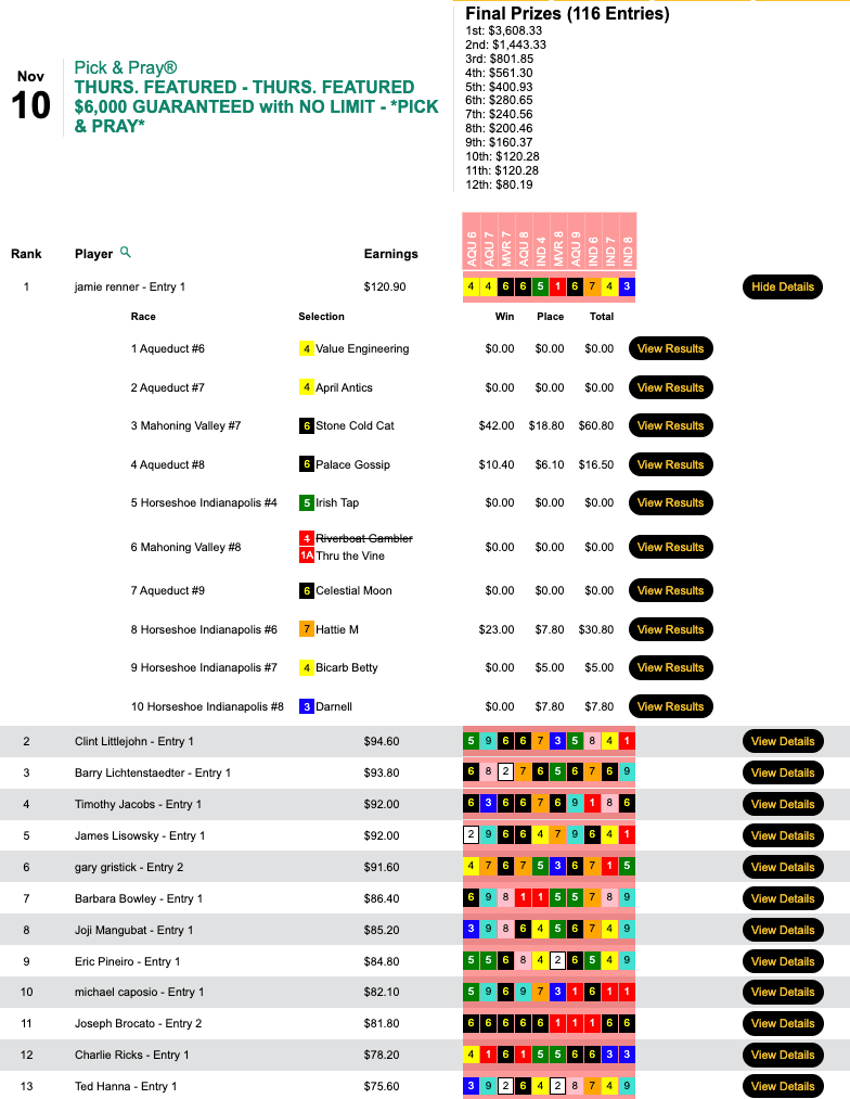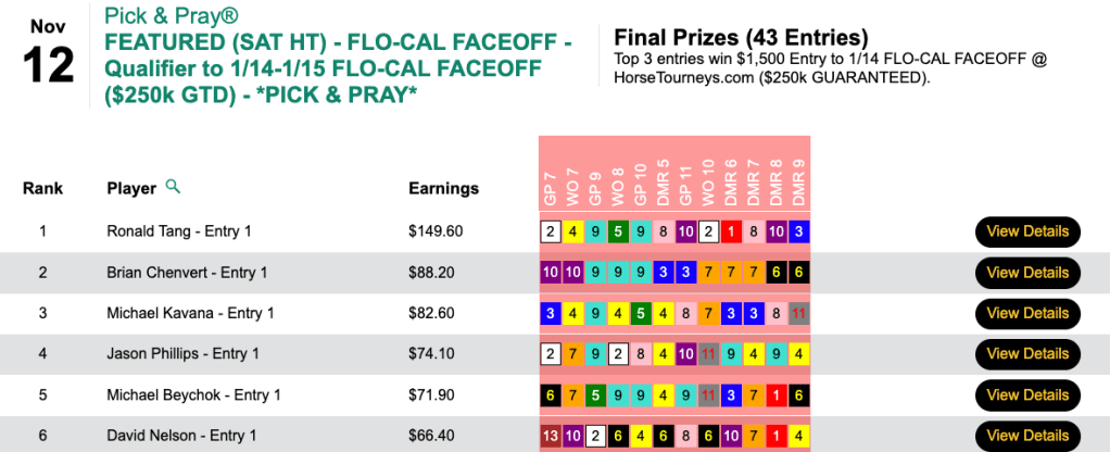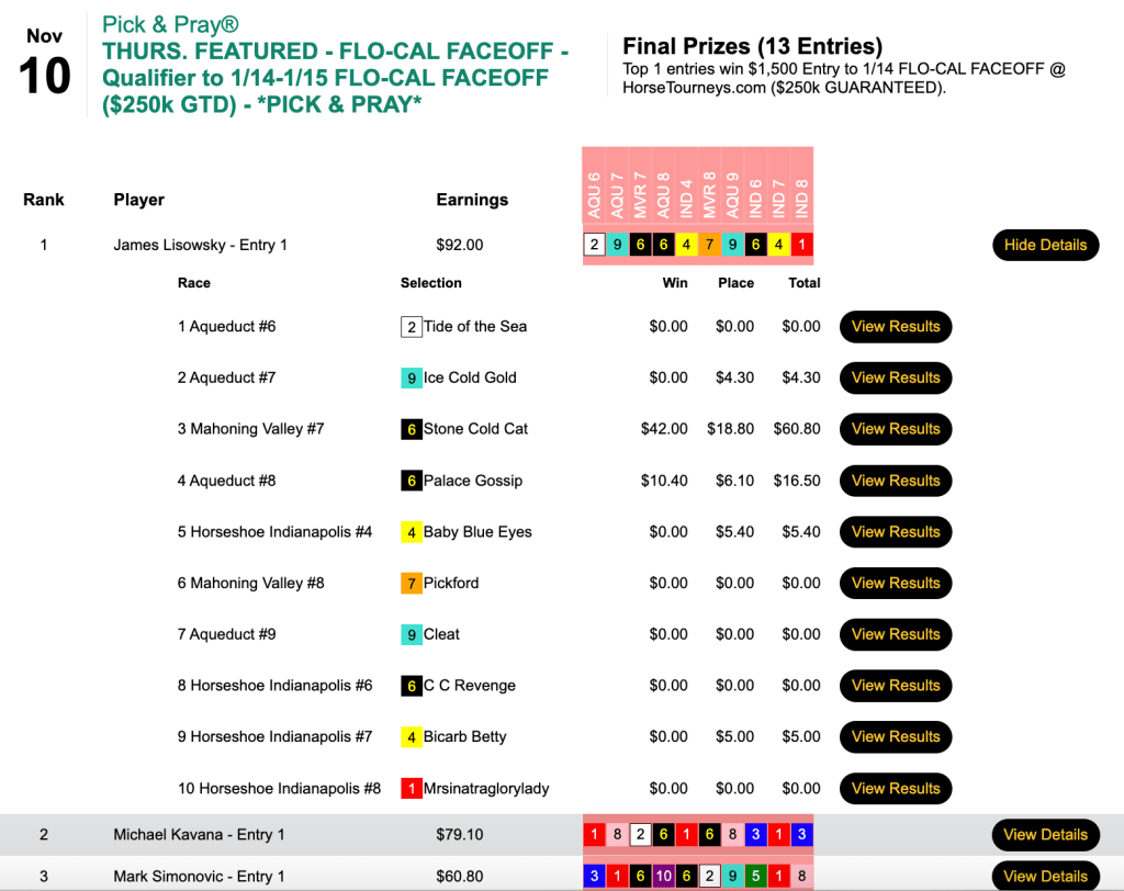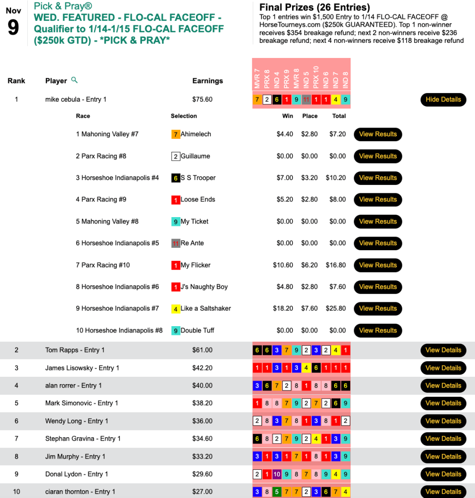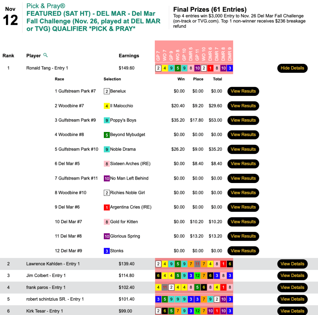 Also earning $3,000 seats into the November 26th contest were Lawrence Kahlden (4W, 1P), Jim Colbert (3W, 1P) and Frank “Plaster of” Paros (5W, 3P). Tang, Kahlden and Colbert did most of their scoring early, while Paros’s success didn’t solidify until the end. He made collections in each of the final five races, including a $5.20 place payoff in the nightcap that snuck him into 4th.