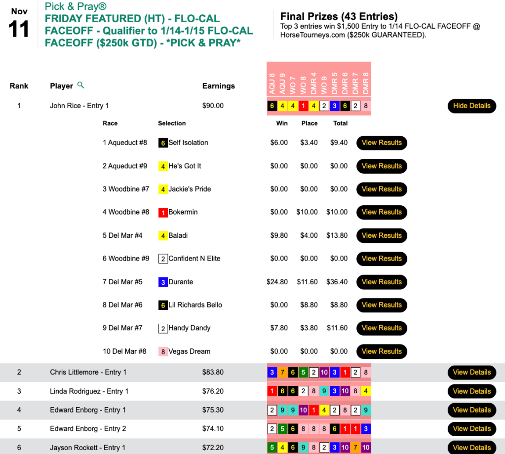 The Friday Flo-Cal Faceoff qualifier was a 1-per-15 event that drew 43 entrants, but three $1,500 seats were awarded. Congratulations to John Rice (4 wins, 2 places), 2018 NHC champ Chris Littlemore (3W, 0P) and Linda Rodriguez (2W, 1P). All three were right on the nose with Durante ($24.80, $11.60) in the 5th at Del Mar.