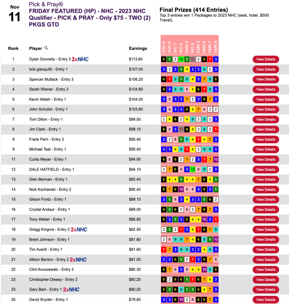 The first-place finisher Dylan Donnelly (3 wins, 1 place) was already double qualified, so the three to earn 2023 berths were Bob Gianquitti (4W, 1P), Spencer Mullack (3W, 0P) and Sarah Wiener (3W, 0P). A final-table competitor at last year’s NHC, Wiener secured 4th place by 80 cents in this one.