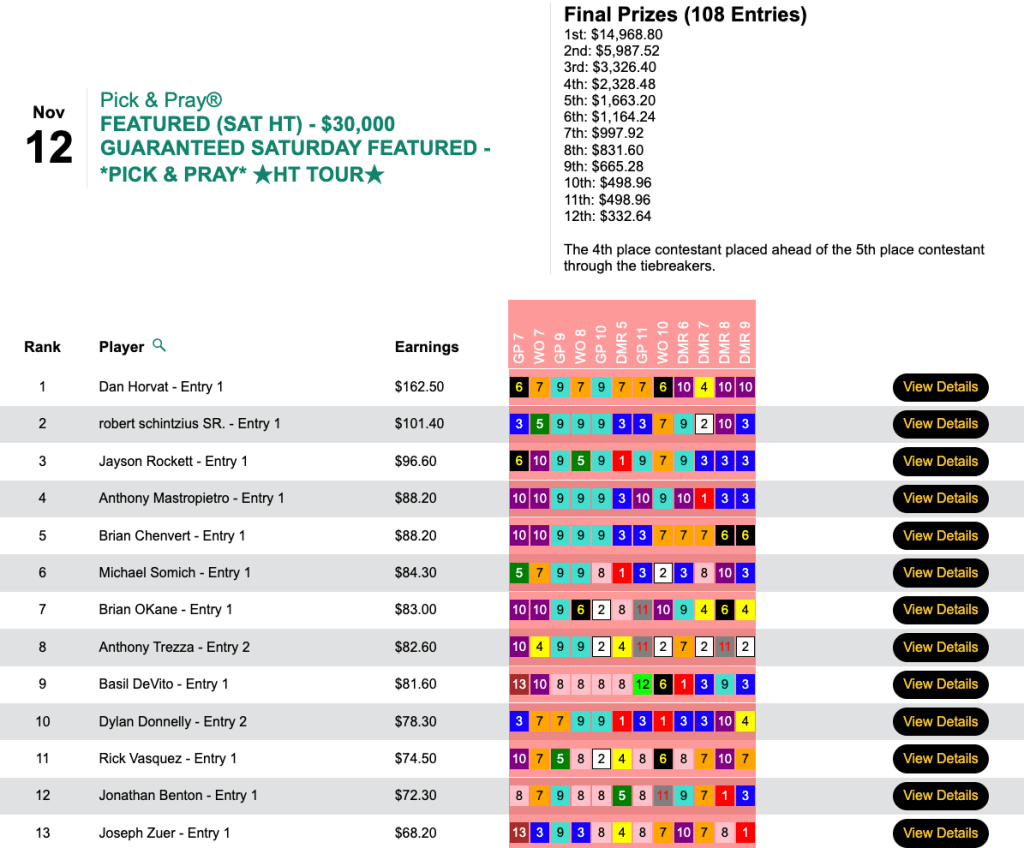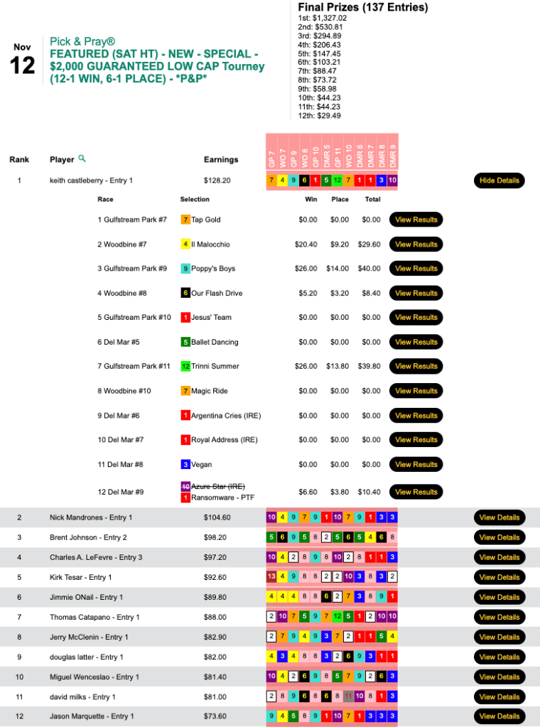Three of Horvat’s four winners in Saturday’s HT Tour event, our $30,000 Guaranteed Pick & Pray, paid $35.20, $26.20 and $19.80. Such returns allowed Horvat to win under a hand ride—by $61.10. The well deserved reward for Horvat was $14,968 in a game ultimately worth a total of $33,264.