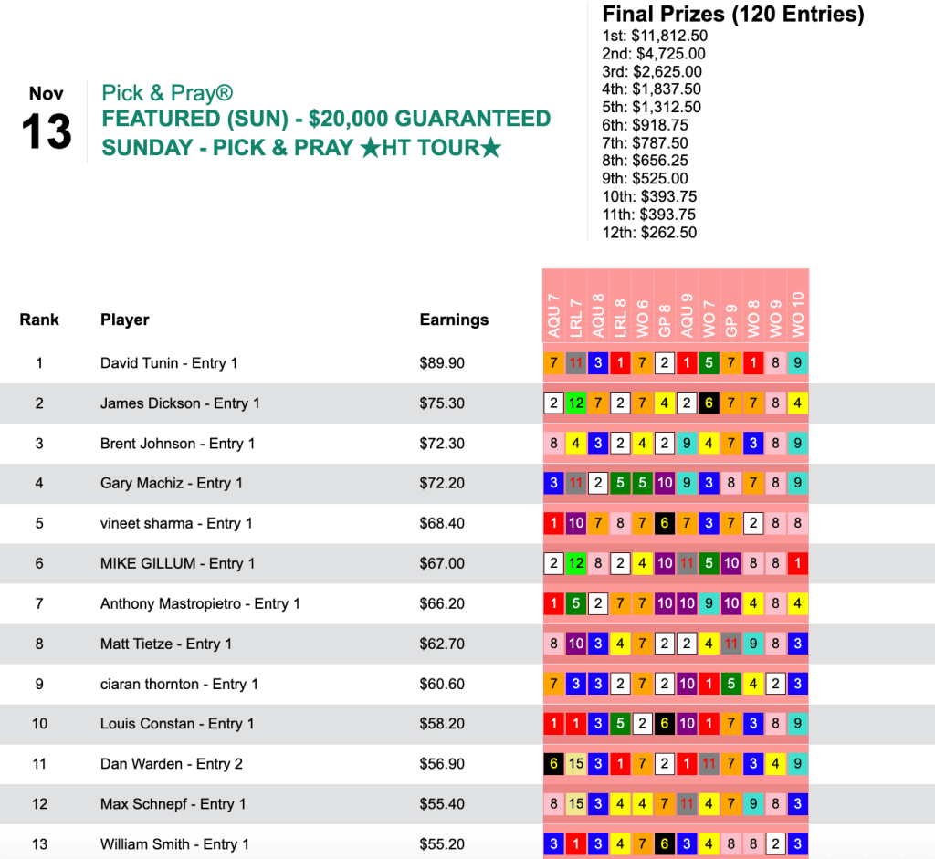Tunin also had 4 other winners plus 3 runners up to take top honors in Sunday’s HT Tour event, our $20,000 Guaranteed Pick & Pray. He collected $11,812 from a total final pot of $26,250.
