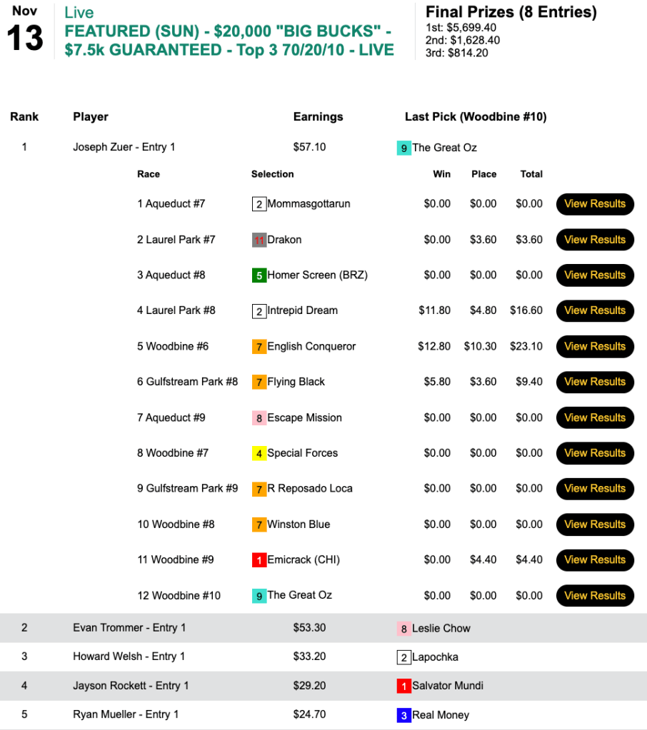 On Sunday, Zuer reinvested some of those Saturday winnings and put up 3 firsts and 1 second. Almost all of his scoring came in the first half of the tourney, including back-to-back winners that paid $11.80 and $12.80. For the day, those happened to be very solid prices, and despite cooling off late, Zuer escaped with a victory that was worth another $5,699. That brought his two-day Big Bucks revenues to $12,823. It will be fun to see whether Zuer can keep things going next Saturday.