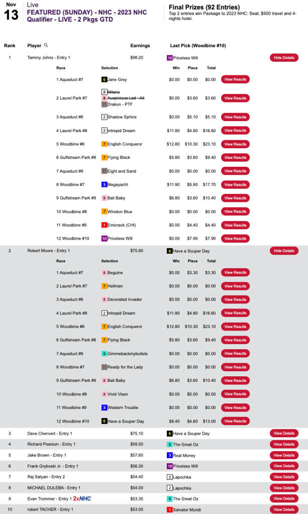 It was Tammy Johns, whose 5 firsts and 4 seconds took Sunday’s $210 NHC qualifier with surgical precision. Robert Moore took home the other available 2023 berth thanks to 5 wins and a place.