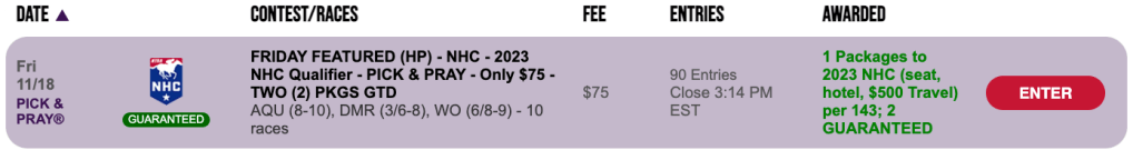 There will be two Sunday NHC qualifiers this week, and one will be held right here at HorseTourneys.The one here at HT is a $165 Pick & Pray with two seats guaranteed. The winning ratio is 1-per-65.