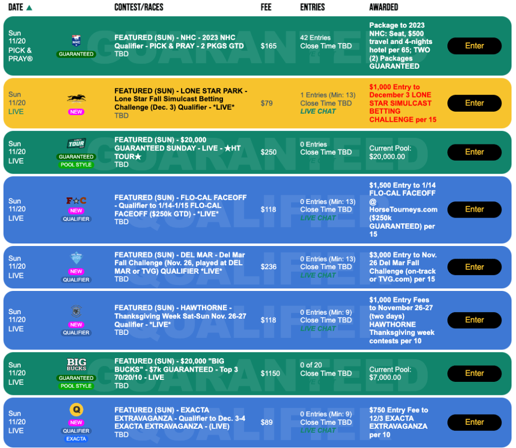 As touched upon earlier, we will have Sunday qualifiers (all in Live format) to the Flo-Cal Faceoff ($118 buy-in), the Del Mar Fall Challenge ($236), the Hawthorne Thanksgiving contests ($118) and the Lone Star Fall Simulcast Betting Challenge ($79).