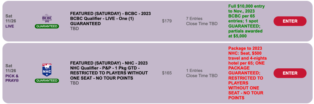 There will be a special, Thursday HT Tour event on Thanksgiving, a $15,000 Guaranteed, No Limit Pick & Pray. You can fill your plate for $190.