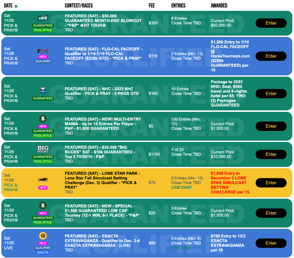 We wrap up Thanksgiving weekend with eight more featured tourneys, including our first Pegasus World Cup Betting Championship (PWCBC) qualifier.