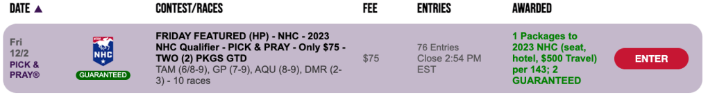 Friday’s marquee game at HorsePlayers is an always-popular $75 NHC qualifier.