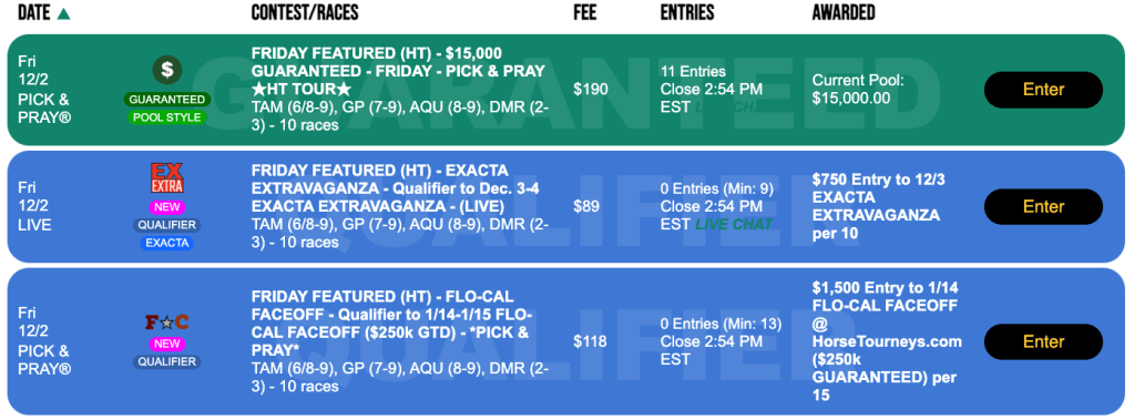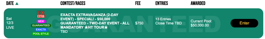 So there’s a lot of money at stake, and a lot of action to be had. The Exacta Extravaganza serves as one of four HT Tour events this weekend (and it counts as a “Saturday game” if you are keeping track of such things!). Our first HT Tour competition of the week is part of the featured schedule on Friday.