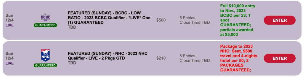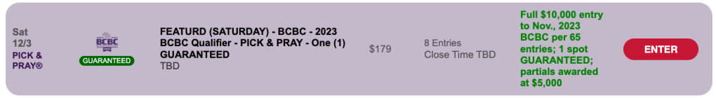 The BCBC play-in is a Low Ratio game. The entry fee is $500; the winning ratio is 1-per-23; and at least one $10,000 seat is guaranteed.