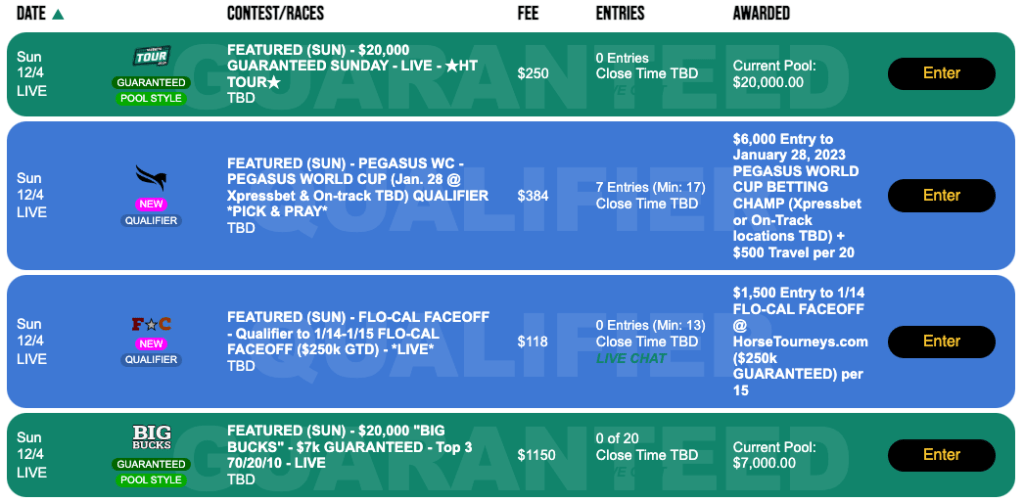 An upfront investment of $384 on Sunday will get you a 1-in-20 chance at a $6,000 Pegasus World Cup entry, plus $500 for your travel needs. It’s a Live-format tilt.