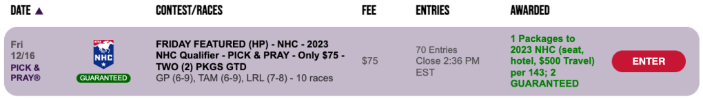There are two NHC qualifiers available on Sunday, and the one here is HorseTourneys is the day’s lone Pick & Pray. It’s a $165 two-seater that carries a winning ratio of 1-per-65.