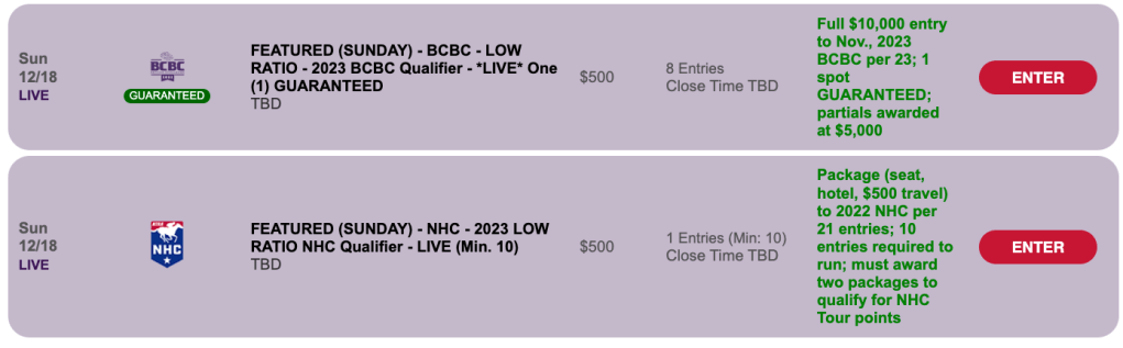 The NHC qualifier is a special $500 Low Ratio qualifier. It’s a Live-format game with a winning ratio of 1-per-21, but it will only be run if we get at least 10 entries. Note that, per NHC Tour rules, NHC Tour points will only be awarded if there are enough entries (in this case, 42) to award two seats.
