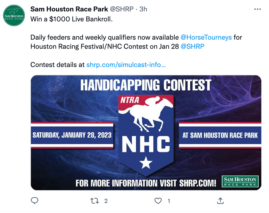 Meanwhile, Sam Houston Race Park has announced that it will be hosting an on-track NHC play-in on January 28th. Your first chance to earn a $1,000 entry for that event also takes place this Sunday.