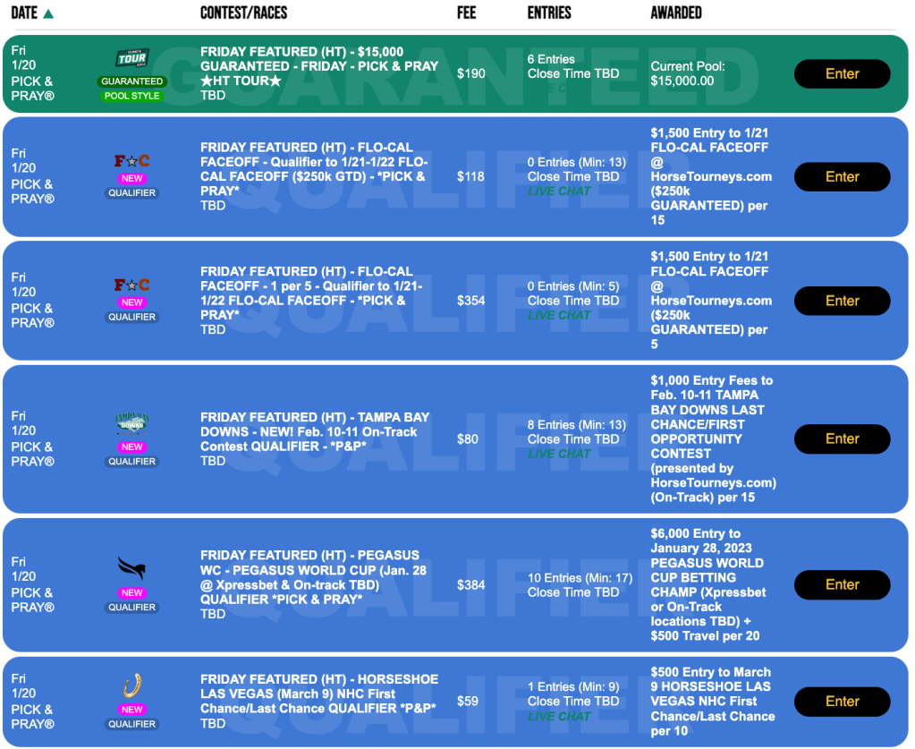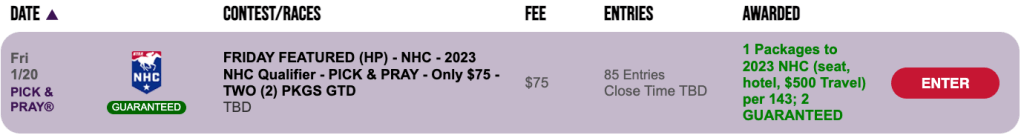 HorseTourneys will play host to Saturday’s NHC qualifying opportunity, a “regular,” $165 Pick & Pray. The winning ratio is 1-per-65 and two March spots are guaranteed.