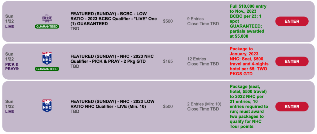 Another offering on the Saturday (and Sunday) menu is a Pick & Pray play-in to the NHC qualifier on January 28 at Sam Houston Race Park. For $79, you can try your luck in this 1-per-15 proposition. Winners get a $1,000 seat for the on-track-only Texas contest.