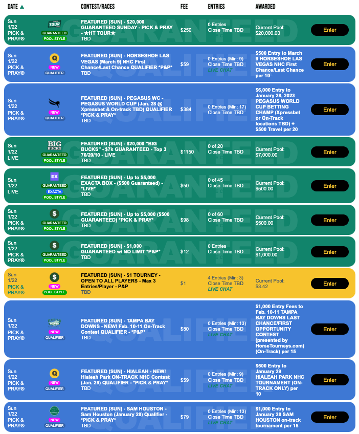 Once more we have scheduled direct qualifiers to the NHC First Chance/Last Chance tournament, the Sam Houston NHC Qualifier, the Hialeah NHC qualifier, the Tampa Bay Downs High Rollers Contest and the Pegasus World Cup Betting Championship. All are Pick & Prays with the same price points and winning ratios as their Saturday counterparts.