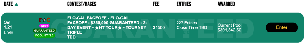 Buy-ins to the Flo-Cal Faceoff, at $1,500 per entry, will remain available until post time of Saturday’s first race at Gulfstream—12:10 pm ET. There is a maximum of two entries permitted per person.