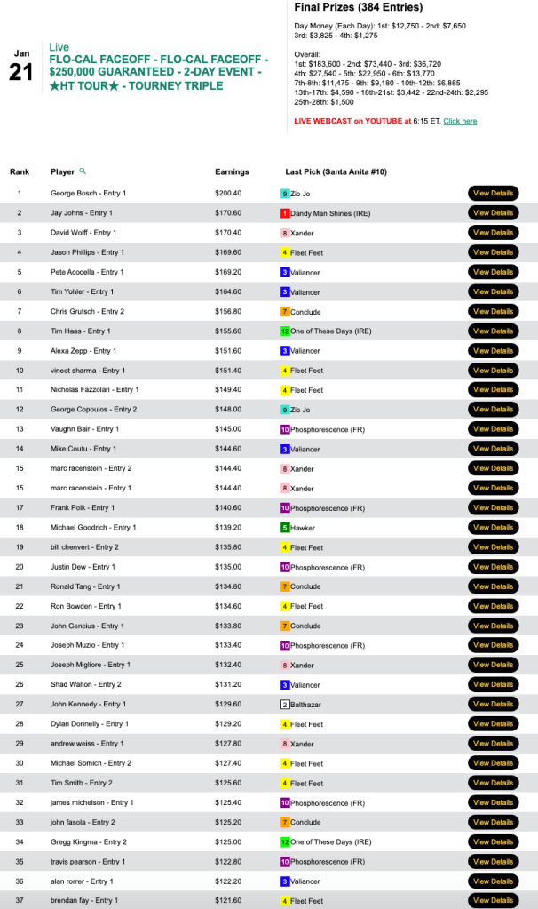 On Saturday, January 21, the skies were clear on both coasts, and all systems were go for the Faceoff to finally commence. When the gates opened for the first race on Saturday at Gulfstream, a total of 384 entrants had been attracted, resulting in an overall, all-cash prize pool of $511,410.