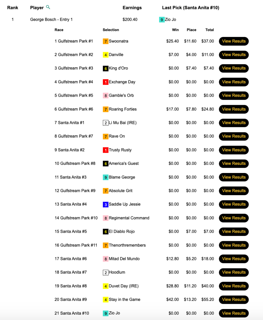Those who had the 21-1 shot rocketed up the leaderboard. Others tumbled backward. No player’s ascent was more eye catching than George Bosch’s. Not only did he have Stay in the Game…he also came up with 13-1 victor Duvet Day in the race prior.