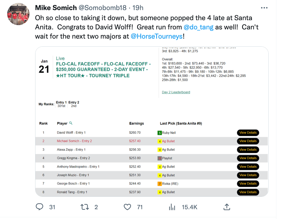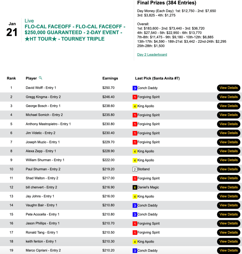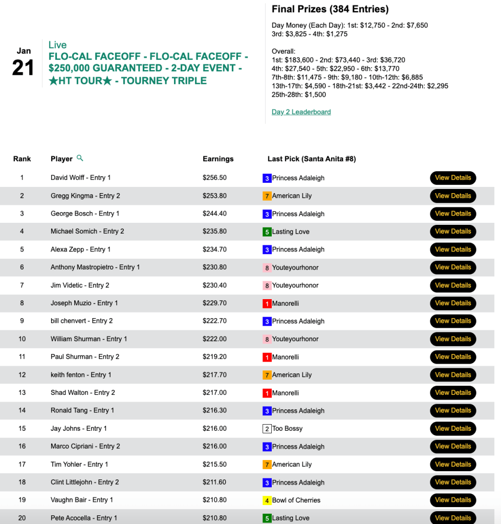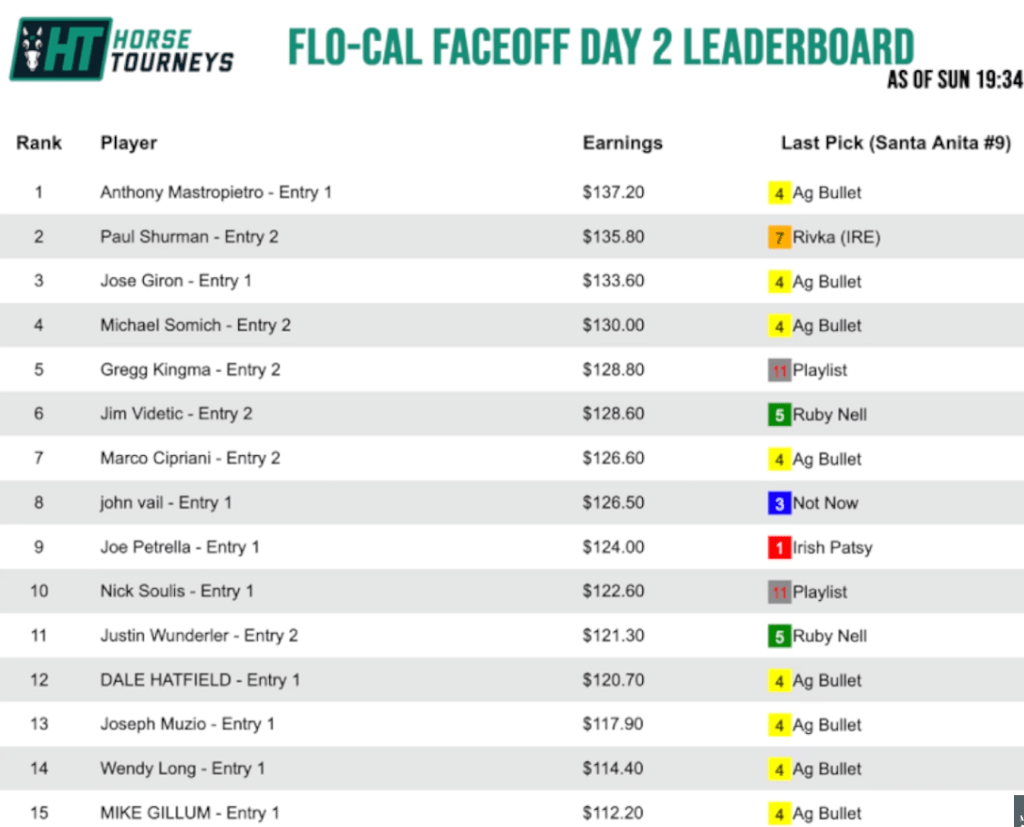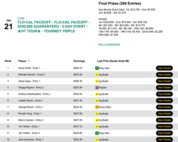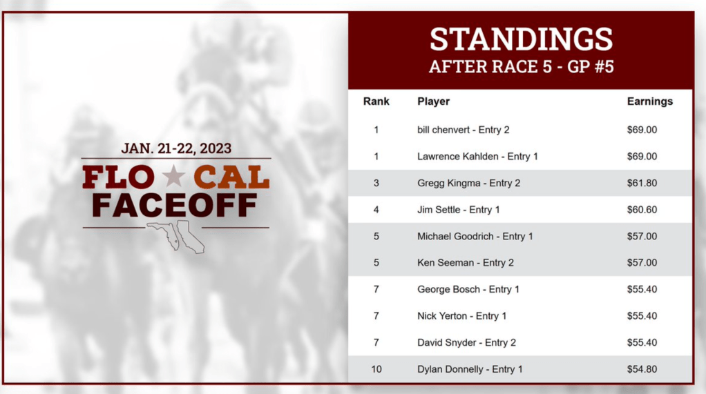 We’ll be back here again tomorrow with a profile of Flo-Cal Faceoff champ David Wolff. We’ll find out what he thought about that last-race odds drop (spoiler alert: he liked it), and we’ll also learn about the rather humorous circumstances surrounding his introduction to contest play just seven years ago.