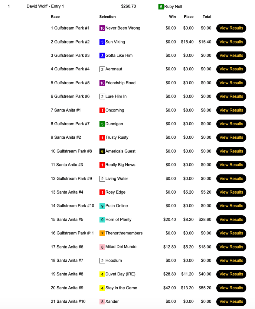 In the next-to-last race, the 8th at Santa Anita, Kingma had the 6-5 winner, but Wolff picked the runner up. So while the standings tightened a bit, Wolff still retained the lead by a scant $2.70.