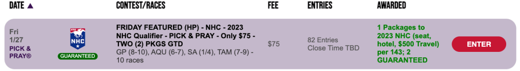 Two seats are guaranteed in this Pick & Pray, which has a winning ratio of 1-per-143 and also offers a good amount of NHC Tour points (which can be extra important at this time of year). Entries are limited to three per person. Remember—you must be a 2022 NHC Tour member, prior to the start of the contest, in order to be eligible for an NHC package in this or any other NHC qualifier. If you’re not a member, you can become one quickly and easily at NTRA.com for a $50 membership fee.