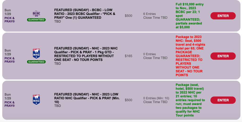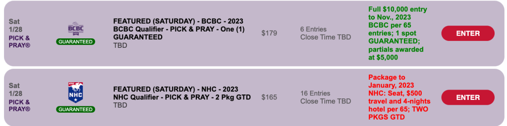Saturday’s NHC qualifying opportunity is also a Pick & Pray. It has a price tag of $165, the winning ratio is 1-per-65 and two seats to the big dance in Vegas are guaranteed.