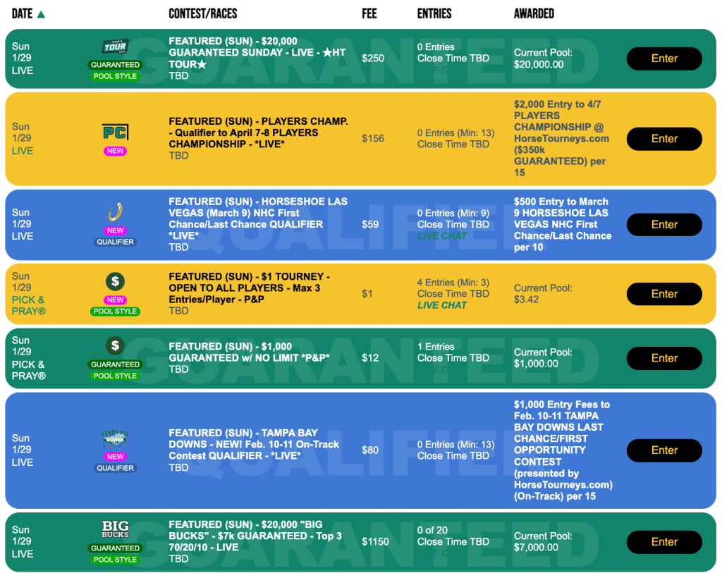 Good luck to all our valued HorseTourneys qualifiers who will be representing us on Saturday at the Pegasus World Cup Betting Championship and at the Sam Houston NHC qualifier. We also appreciate the players who play in our $1 tourneys. We like to think that we have something for everyone. One thing is for sure—no matter the stakes, there’s nothing like seeing your name at the top of the leaderboard. This weekend, we hope that’s you.