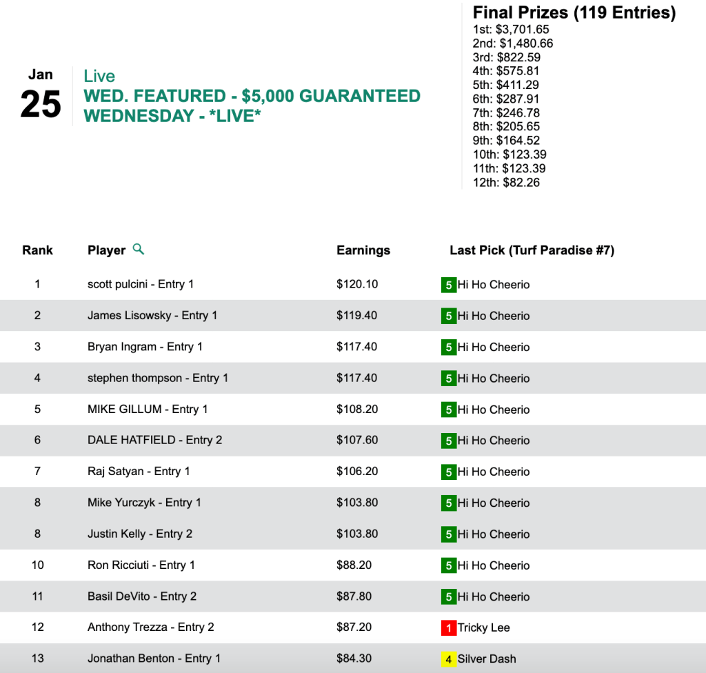 Pulcini nailed the final two races at odds of 15-1 and 20-1, respectively, to earn $3,701 from a pot that wound up at a robust $8,225.