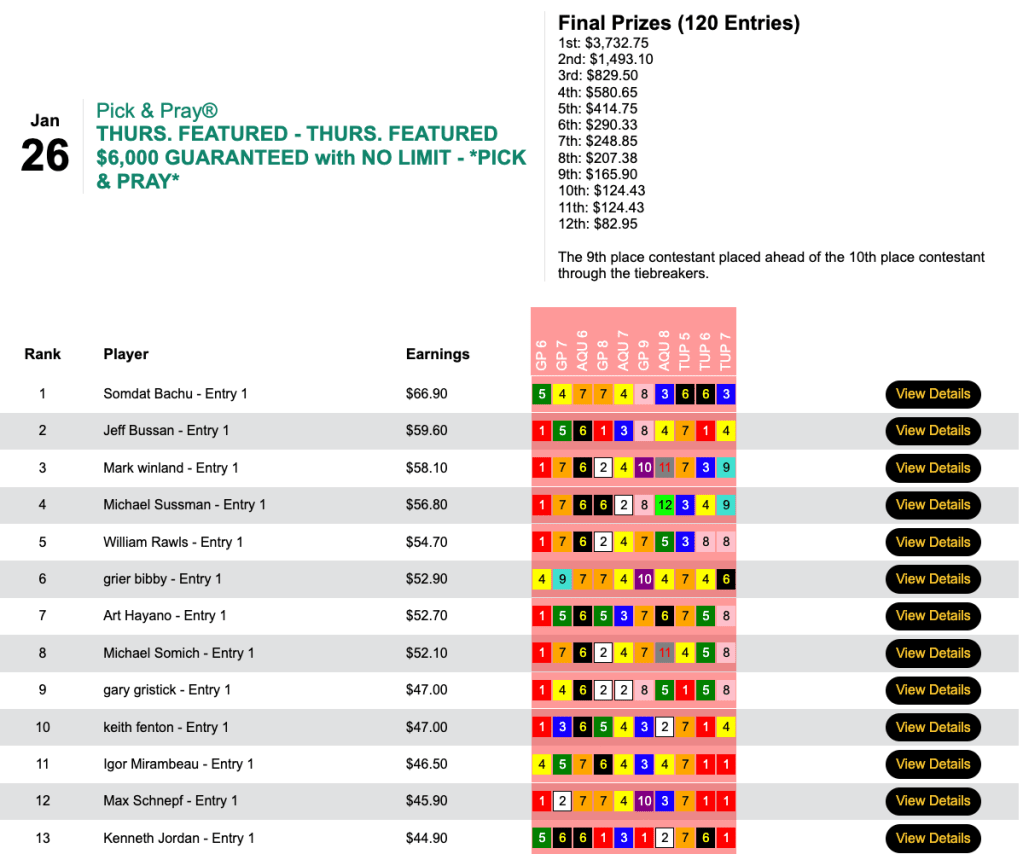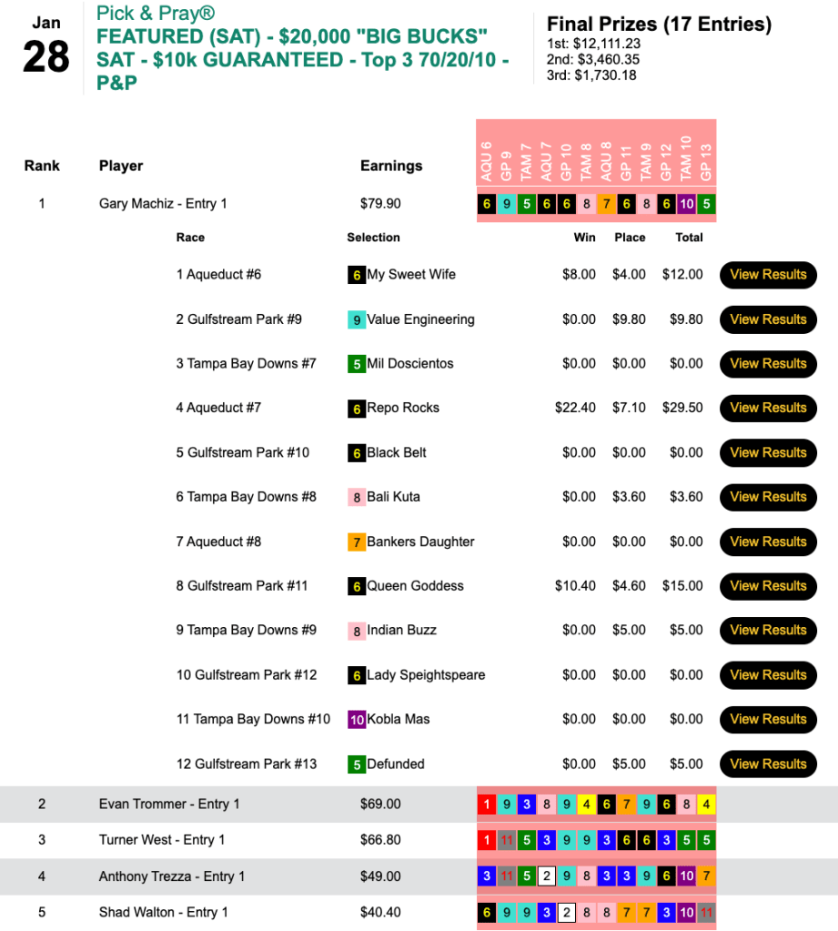 That would be Gary “Macho Man” Machiz (3 firsts, 4 seconds) who, like Behnke, counted Repo Rocks as his biggest producer. Machiz bagged $12,111 in the $10,000 Guaranteed Pick & Pray that closed up shop with a hefty final pot of $17,301.