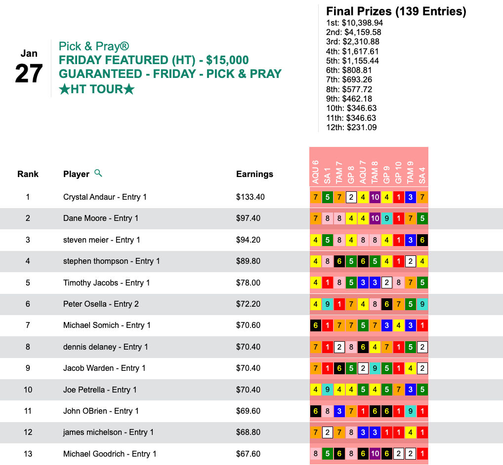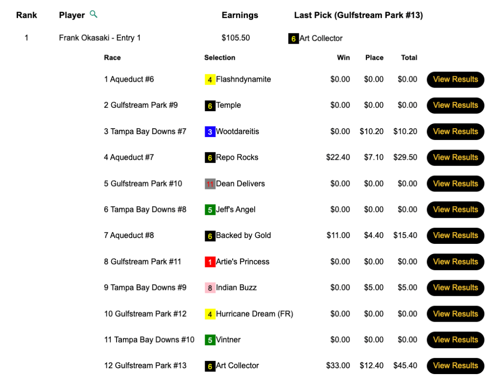 Okasaki had Art Collector ($33.00, $12.40) in the big race, and that enabled him to jump up and win $18,156 in the day’s HT Tour battle, our $30,000 Guaranteed cash game, which wound up paying out more than $40,000. Jayson “Radio City” Rockett finished a strong second to pick up $7,262.