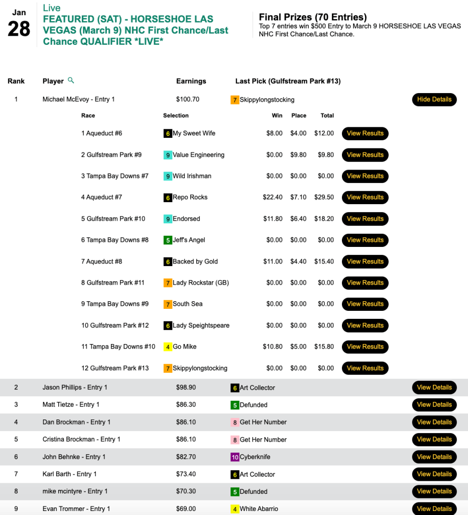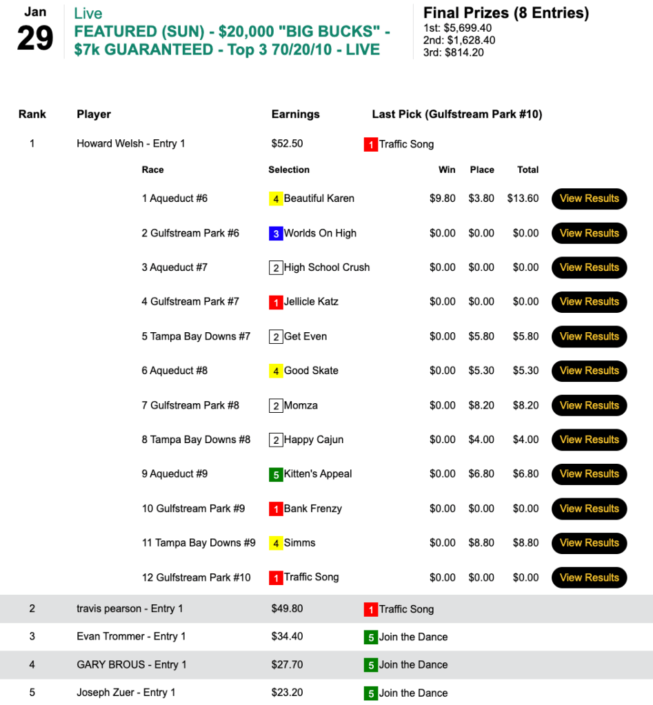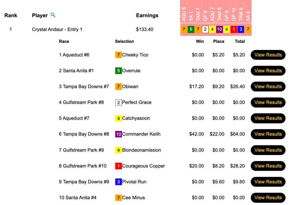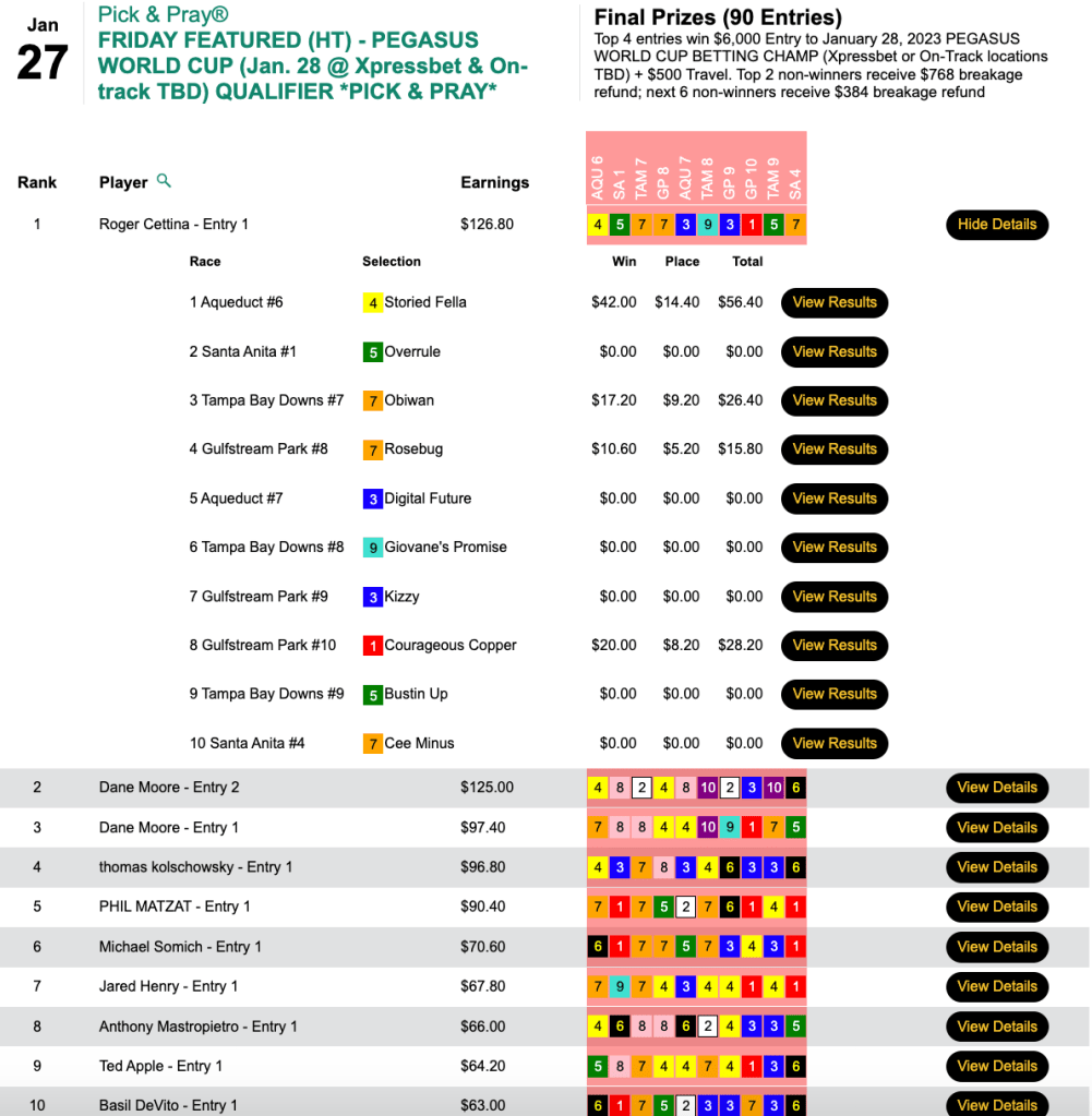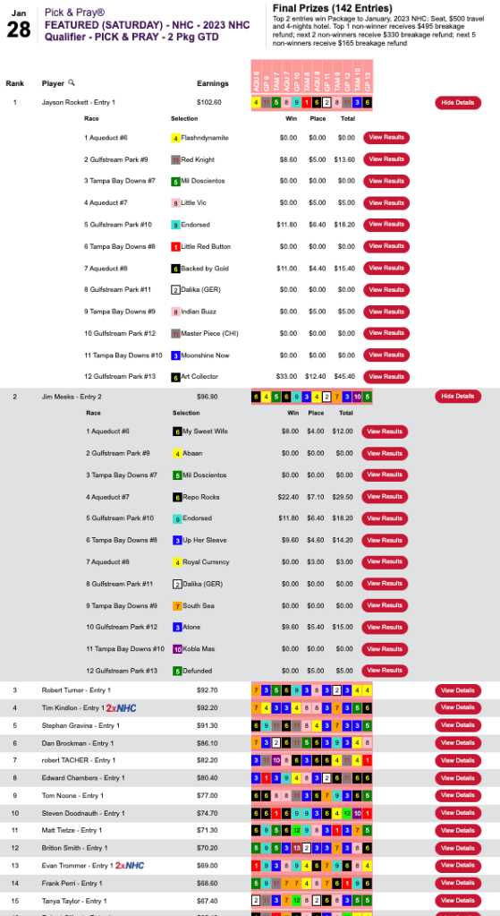 Art Collector wrapped up Rockett’s big day as well. The other seat winner was Jim Meeks, who also hit the Pegasus World Cup at the end, but not in the same way. Meeks (4W, 3P) had runner up Defunded, and the $5.00 place return got Meeks up into second.
