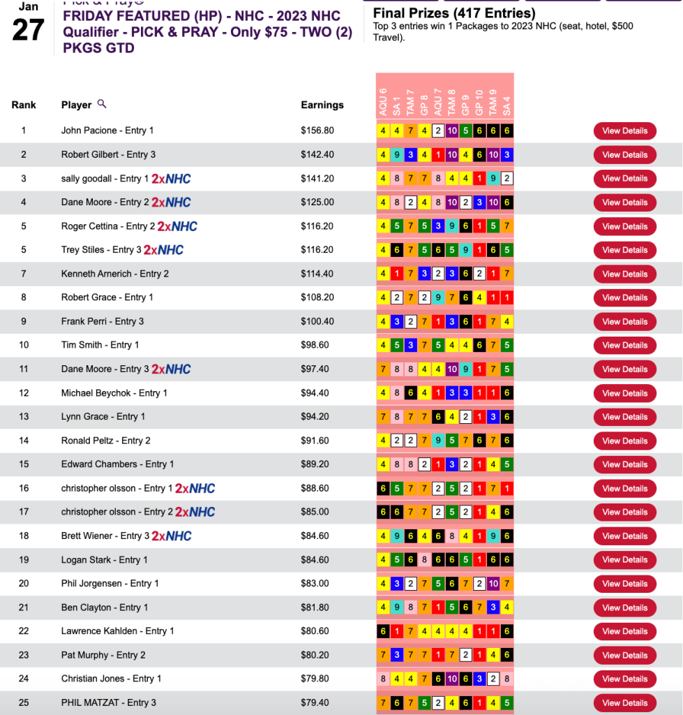 Pacione had 4 winners in all, and he led the way with the high score of the day in Friday’s $75 NHC qualifier at HorsePlayers.
