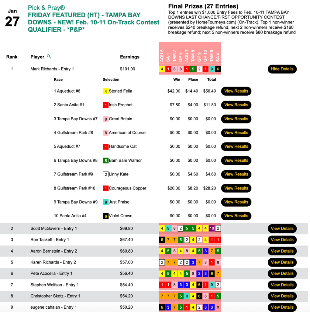 Among Friday’s 10 contest races in our multi-track tourneys, there were two big longshots that won—Storied Fella ($46.00, $14.40) in the 6th at Aqueduct and Commander Keith ($137.80, $43.80) in race 8 at Tampa. John Pacione came up with them both.