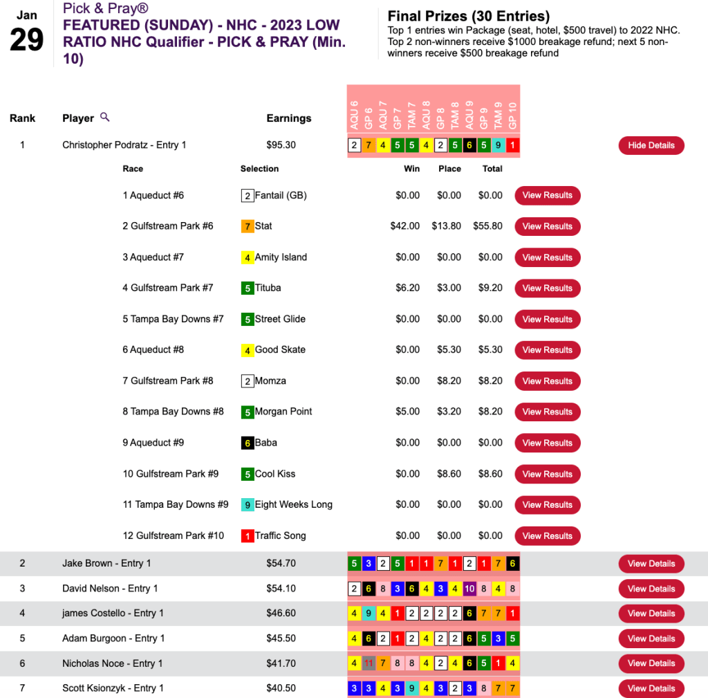 In Saturday’s NHC Pick & Pray at HorsePlayers, Jayson Rockett (4 wins, 2 places) finished a strong…first!